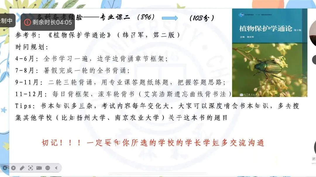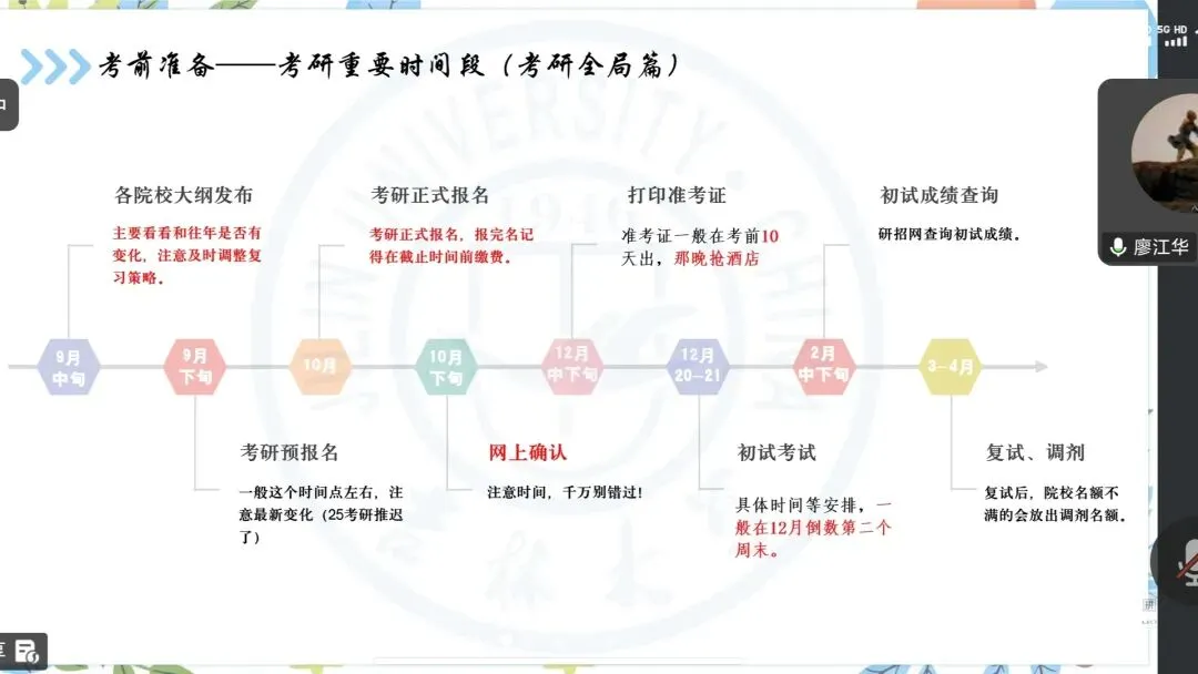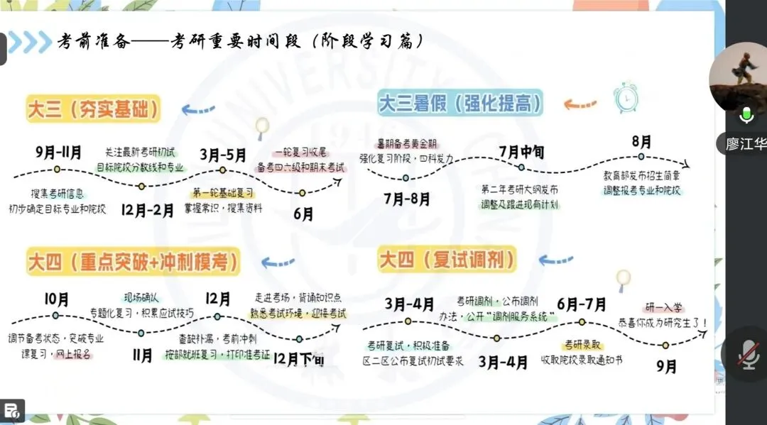 首先,廖江华学姐结合自身备考经历,带来了极具参考价值的实战经验。她从个人背景切入,细致讲述了自己的择校初衷与心路历程。同时,学姐还围绕考研动机的树立、备考前期的准备工作、院校与专业的精准选择等关键问题,进行了层层拆解与耐心讲解。尤为贴心的是,学姐特意为大家生动绘制了完整的备考时间轴,清晰标注出各阶段的核心任务,让原本杂乱无章的备考规划变得条理清晰,也让在场的每一位迷茫学子都找到了属于自己的备考方向,收获满满。