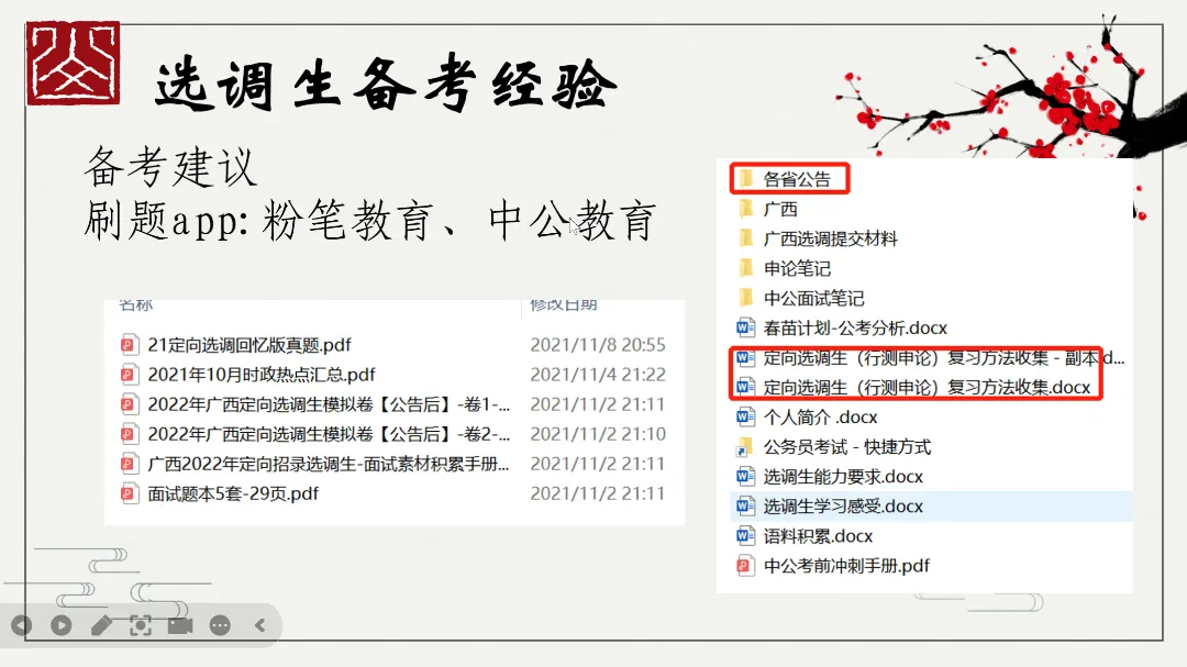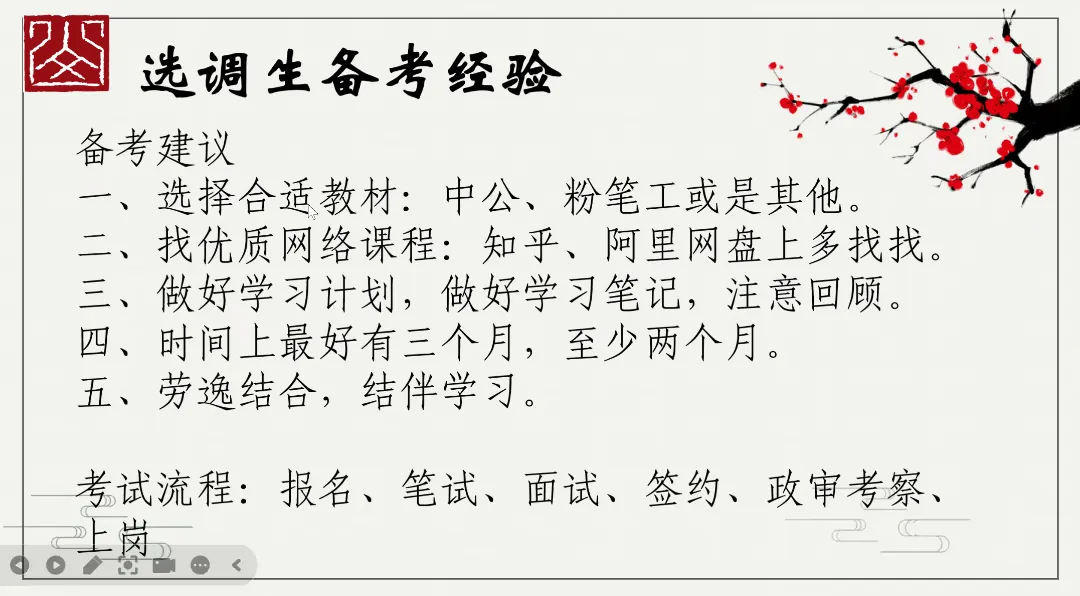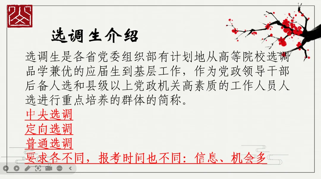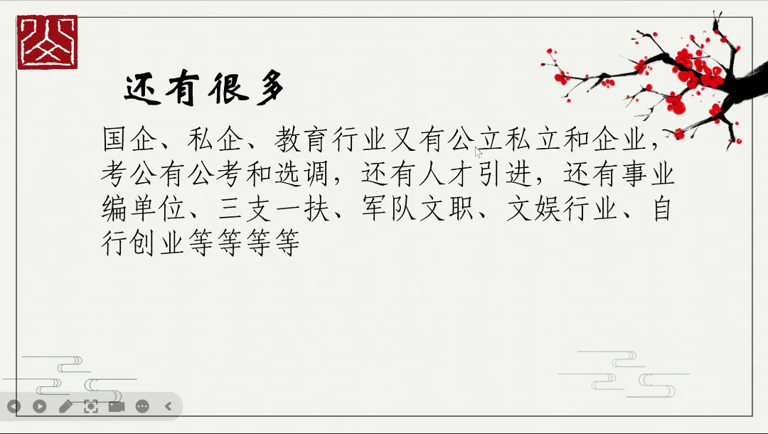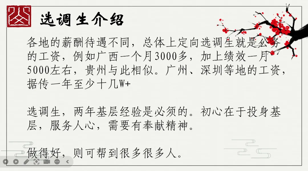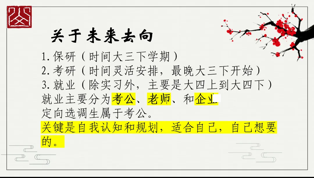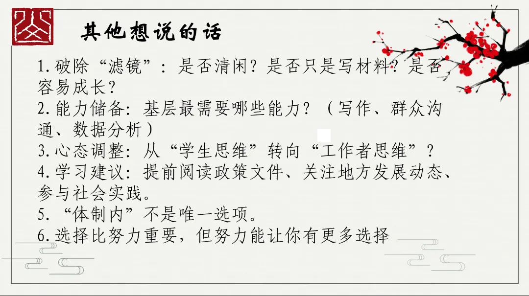 接着,甘学长则聚焦选调与就业技巧、基层工作经验等方向,为学子们带来了全面且深入的就业指导。学长深知同学们在职业选择上的纠结与迷茫,特意通过直观清晰的图表,对比了不同工作,让同学们能快速对比、精准定位。其中,学长对关于选调方面的备考策略进行详细地分享,为大家未来的就业选择提供了全新的思路与参考。