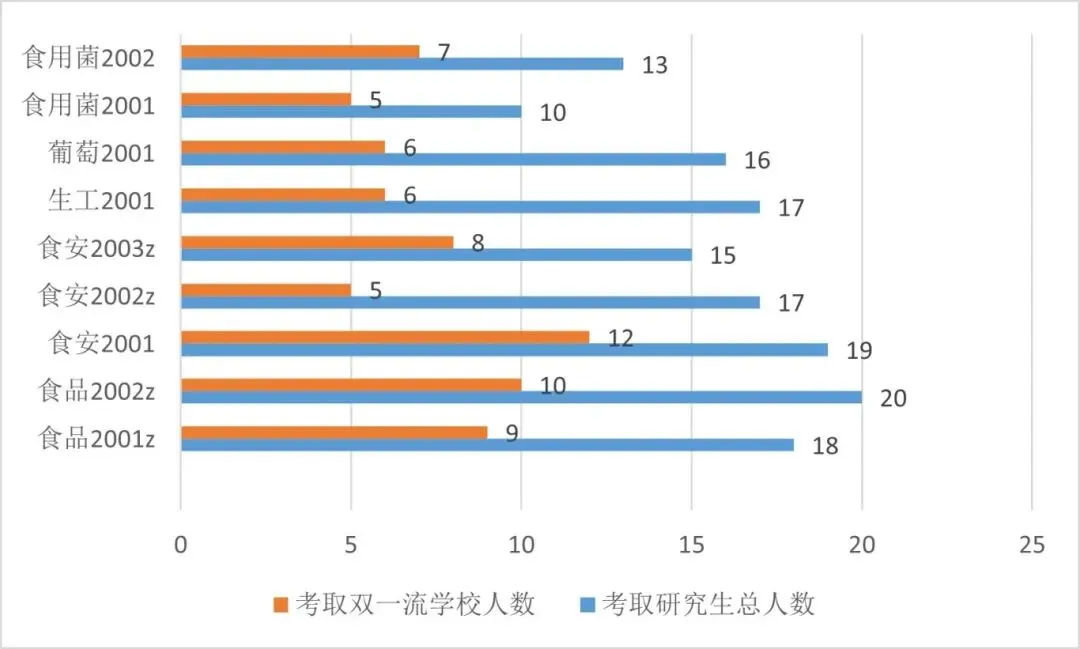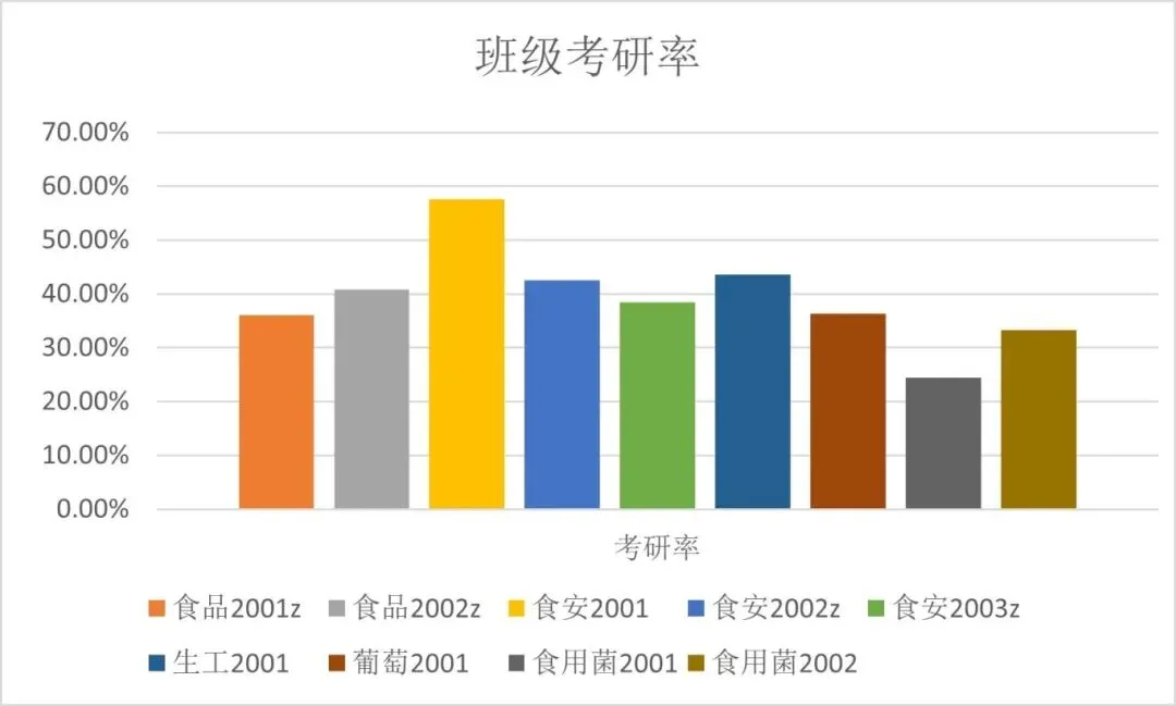 全院共4个班考研录取率超过40%,分别是食安2001班达到57.58%,生工2001班达到43.59%,食安2002z班达到42.50%,食品2002z班达到40.80%。
