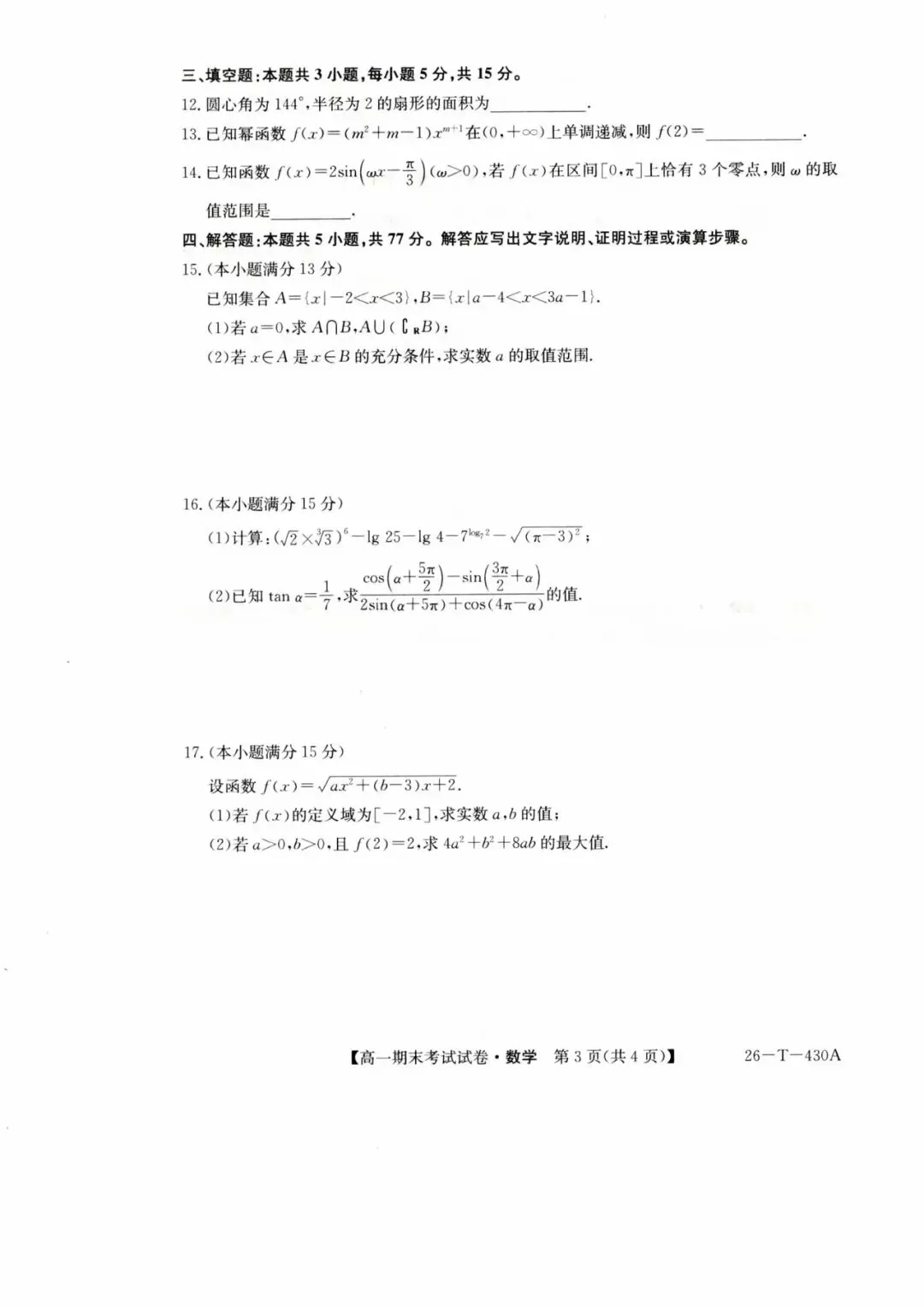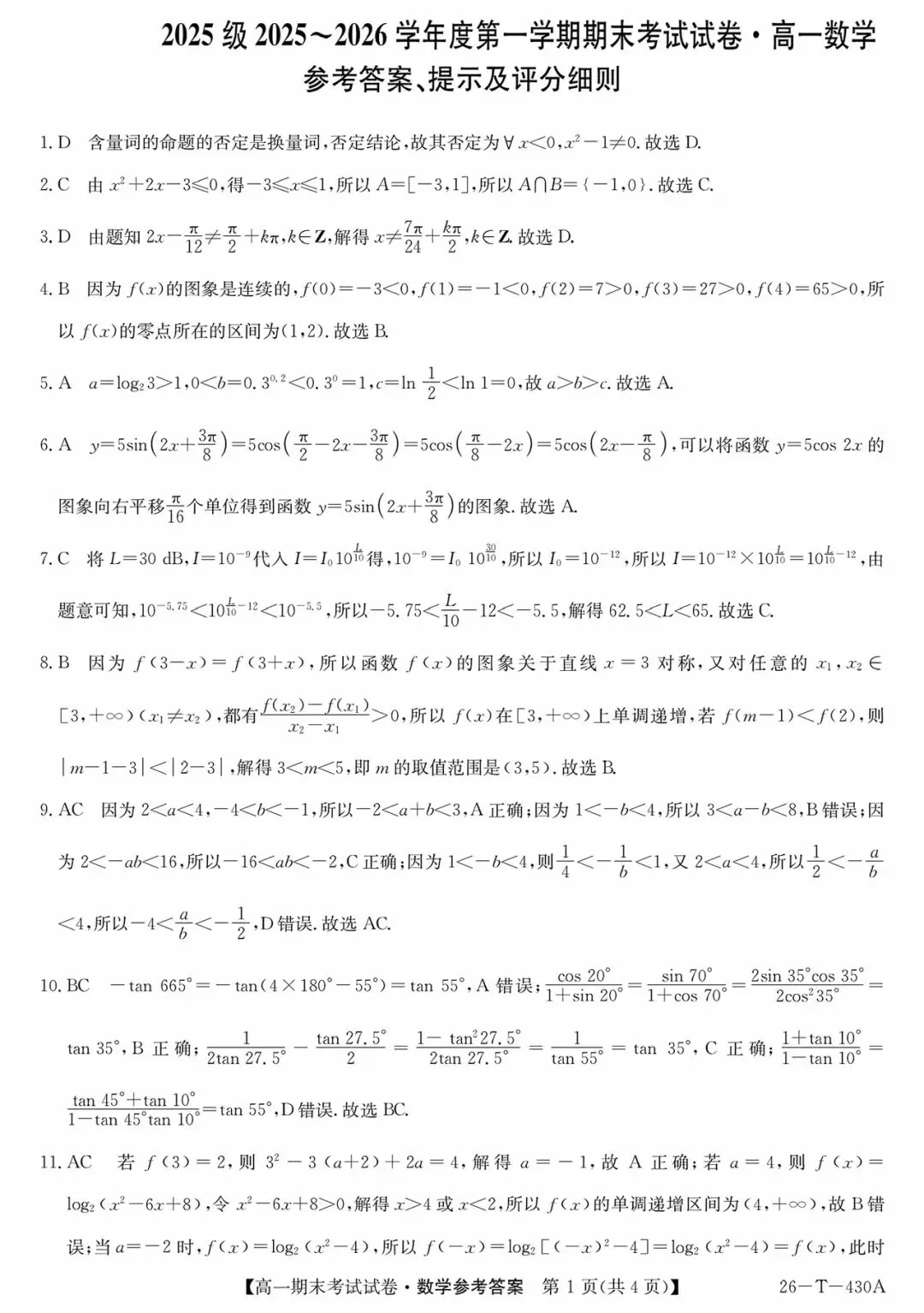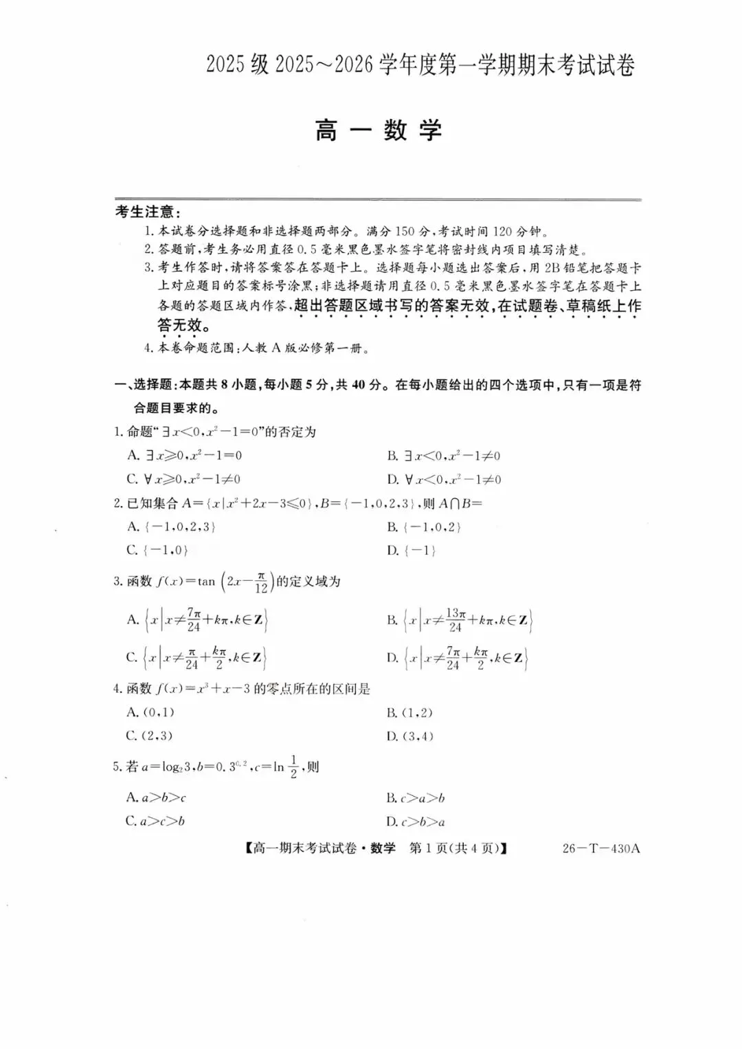 >西安市部分高中2026高一上期末考试数学试题