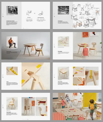 对比跨页式:左页放置设计推导过程(如草图、分析图、结构设计图),右页放置对应的产品渲染图或实物图;或左页文字说明(如用户需求、设计亮点)、右页图片展示,清晰呈现 “问题 — 解决方案 — 最终成果” 的关联;