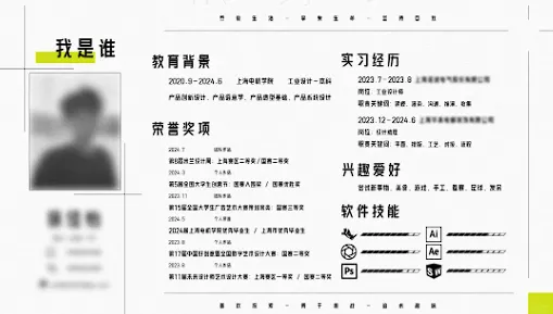 设计理念:用 1-2 句话概括(如 “以用户为中心,平衡功能、美学与落地性的产品设计”)重点突出与工业设计相关的优势经历,让导师快速捕捉你的专业积累与个人特质。