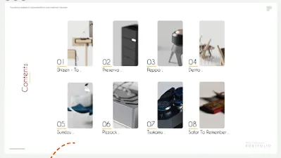 目录项对应 4-5 个核心作品,采用 “大数字 + 作品名称 + 核心关键词” 的形式,可搭配简洁图标(如产品设计用齿轮图标、家居产品用家具图标)或作品小图,实现图文并茂。例如: