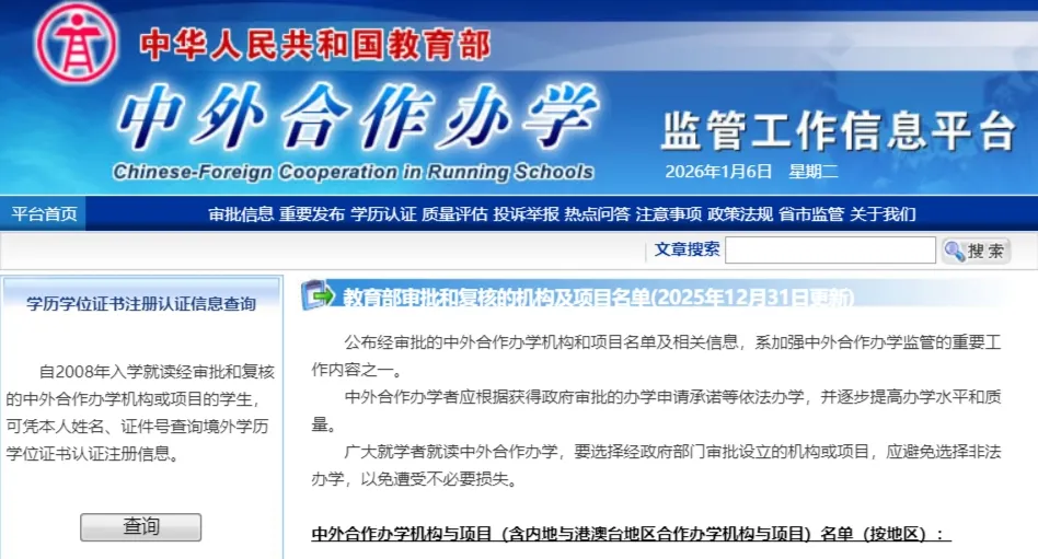 根据《中华人民共和国中外合作办学条例》及实施办法,教育部对2025年下半年申报的中外合作办学机构和项目进行了评审,依照专家评议结果,批准共计57个本科以上层次中外合作办学机构和67个本科以上层次中外合作办学项目。