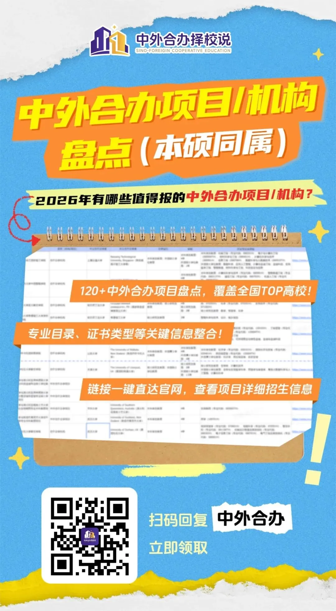 我们汇总盘点了所有本硕同属的中外合办机构/项目,帮大家整理、分析了这些项目的具体情况,内含招生方式、开设课程或专业、颁发证书类别等关键信息,扫描图片二维码,添加老师领取: