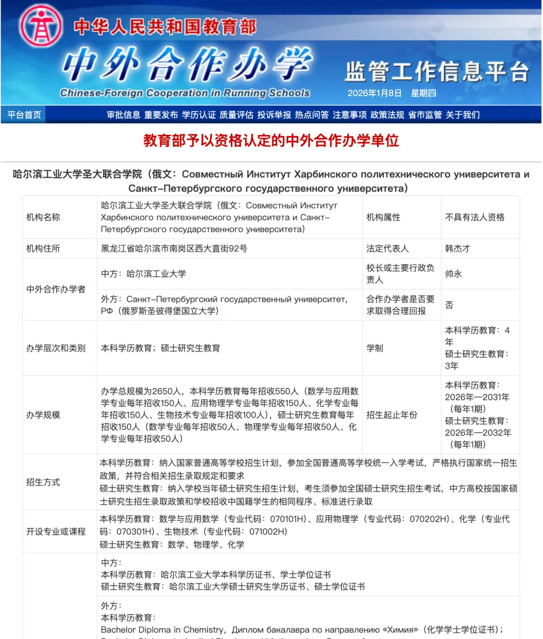 哈尔滨工业大学圣大联合学院是哈尔滨工业大学与俄罗斯圣彼得堡国立大学联合创建的国际合作办学平台。该联合教育机构秉持中俄双方合作理念,旨在把两校数理化生优势资源整合起来进行高等教育合作与联合培养,为符合条件的学生提供本科和硕士研究生教育,并推动双方在科研、课程设置、学术交流等方面的深入合作。