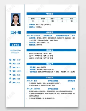 基本信息一栏是直接放在姓名下方,能够给老师简单展示你的概况的信息,包括电话、邮箱、地址、政治面貌等,如实、清晰填写就好。