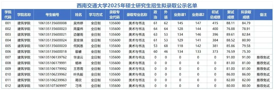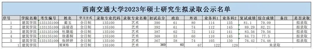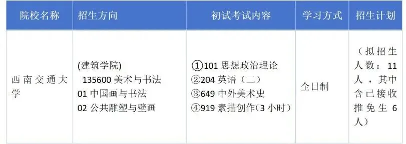 2025年西南交通大学135600美术与书法拟招12人,其中6人推免,一志愿录取初试最低分数线为415分,录取初试最高分数线为373分。