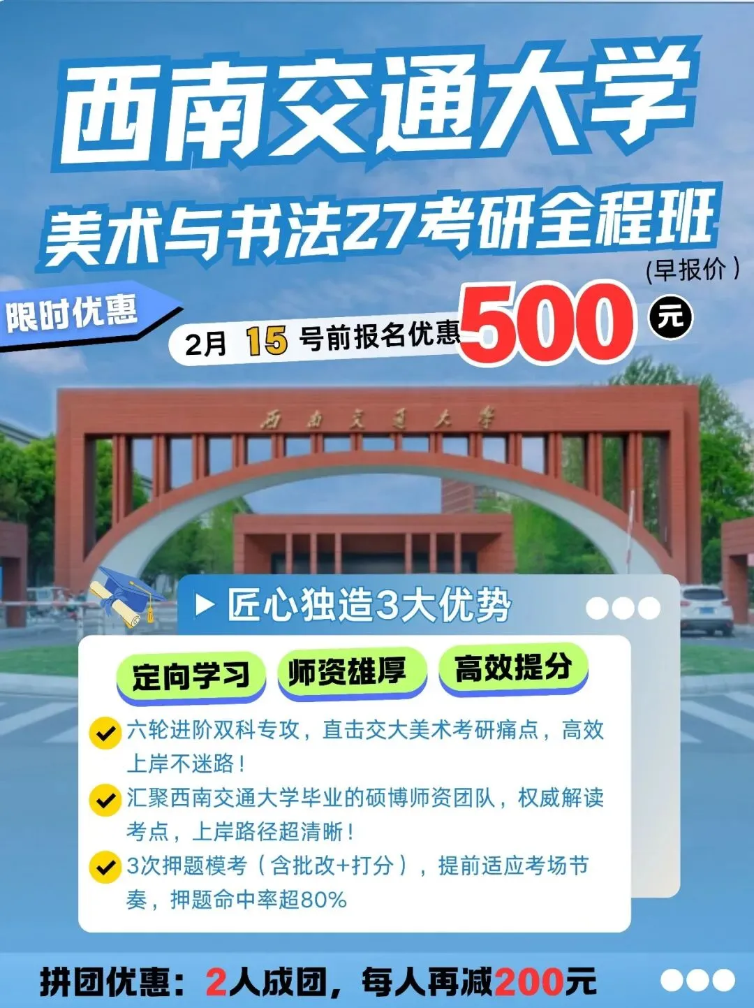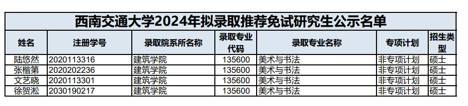 2024年西南交通大学135600美术与书法拟招9人,其中4人推免,一志愿录取初试最低分数线为402分,录取初试最高分数线为376分。