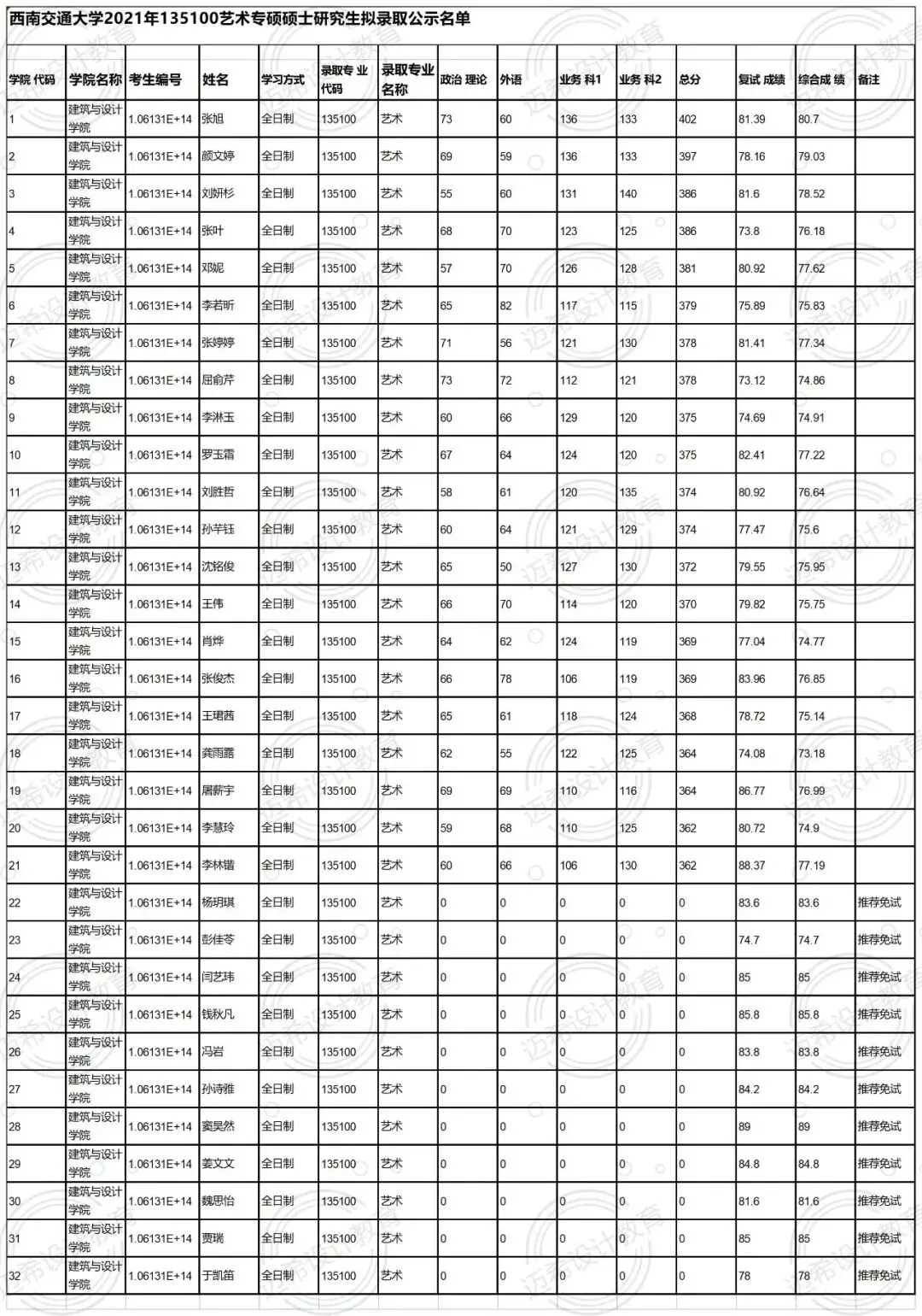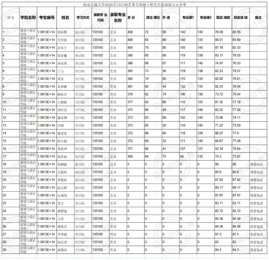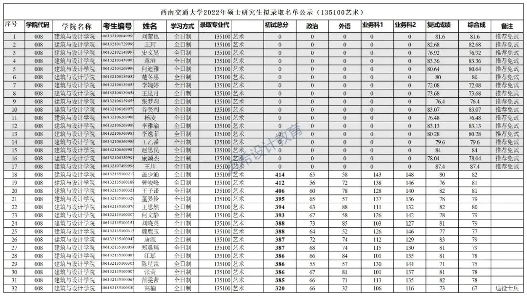 2022年西南交通大学135100艺术专硕拟招32人,其中17人推免,2022年艺术设计推免录取13人,美术推免录取4人。一志愿录取初试最低分数线为385分,录取初试最高分数线为414分。