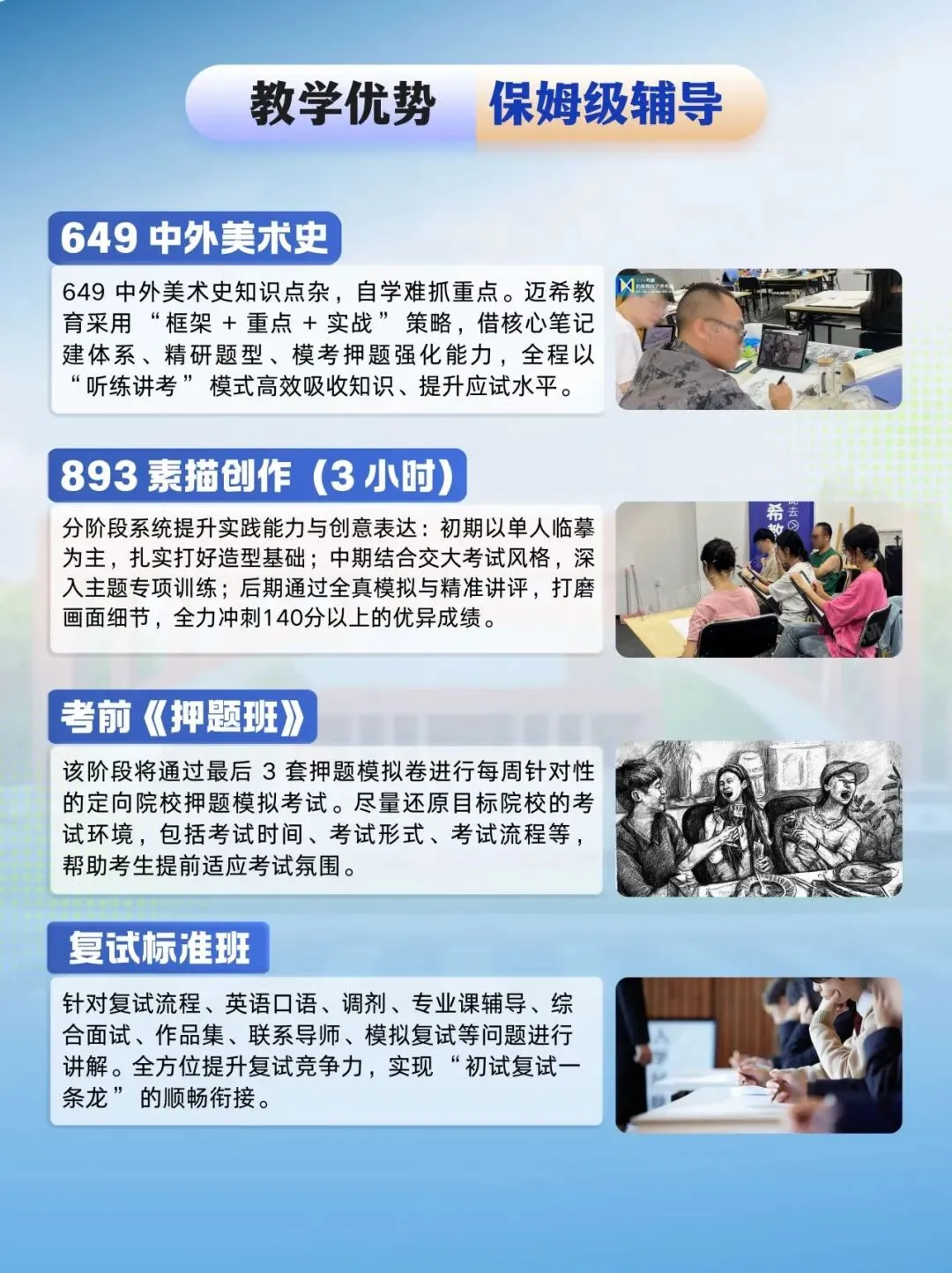 迈希设计教育隶属于成都迈希教育科技有限公司,是一所专业从事艺术类考研的优质的教育机构,拥有一支爱岗敬业、团结奋进、善于学习勇于探索的教师队伍,不断的推出更新、更优质的教学和服务。自成立以来,迈希始终以“用心做教育”为宗旨,谨守诚信办学的行为准则,始终把学生利益放在首位,助力各位考研学子圆梦名校!深受广大学子信赖。