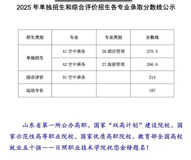 日照职业技术学院单招综评录取分数线: