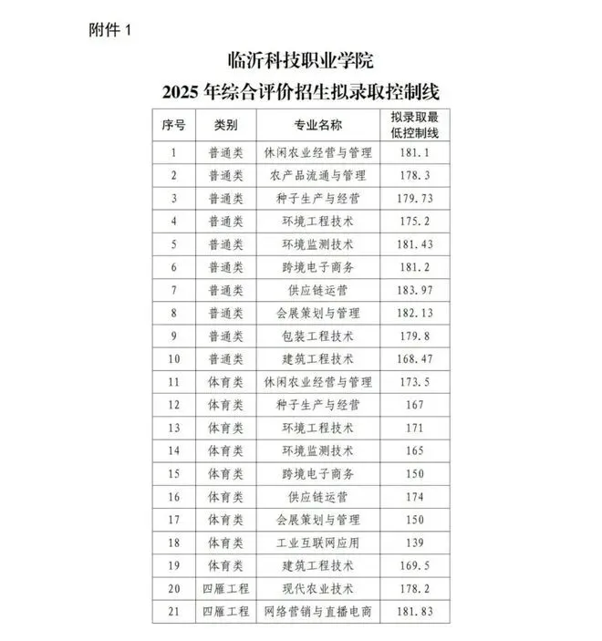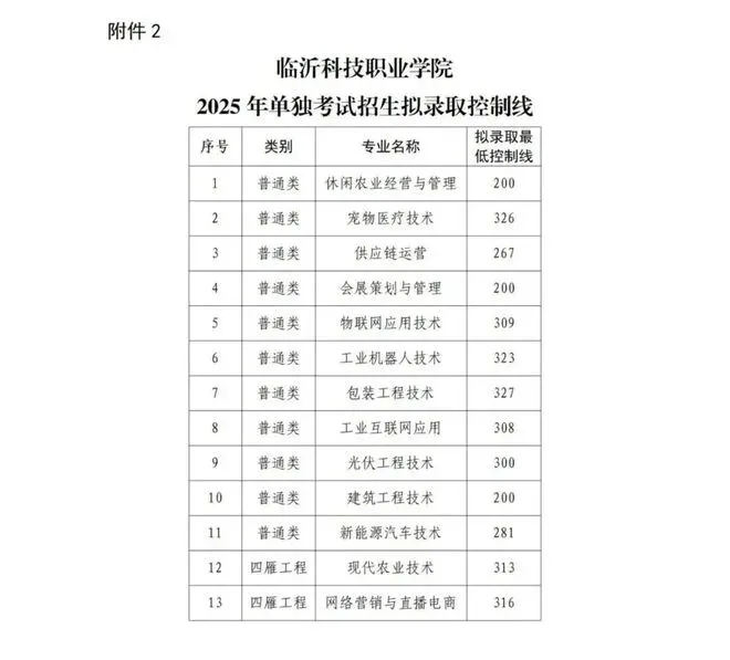 临沂科技职业学院单招综评录取分数线: