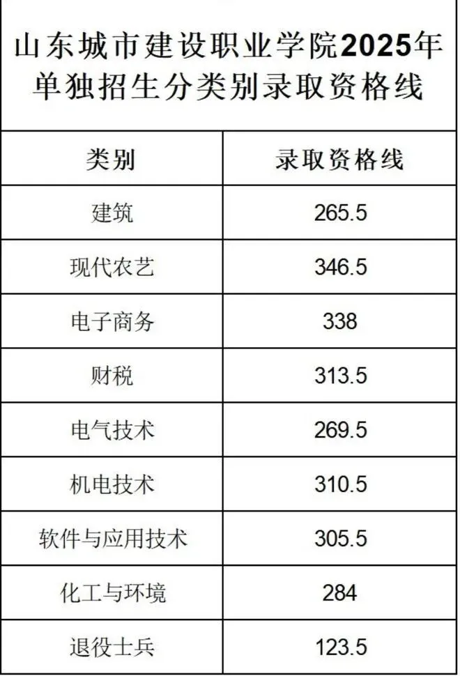 山东城市建设职业学院单招综评录取分数线: