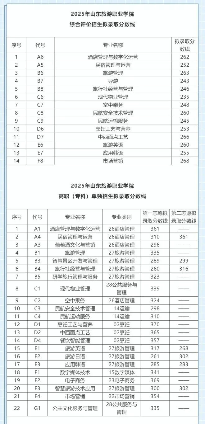 山东旅游职业学院单招综评录取分数线: