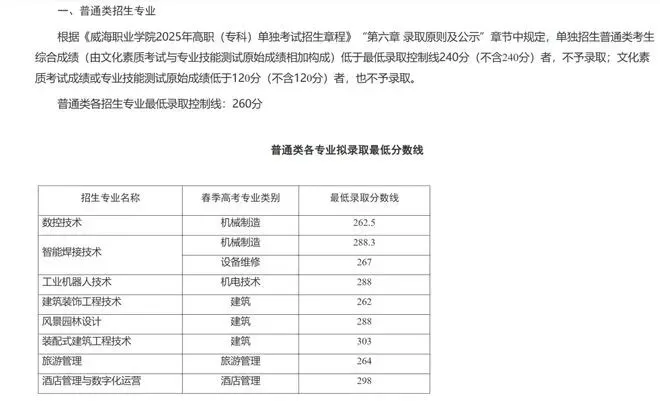 威海职业学院单招综评录取分数线: