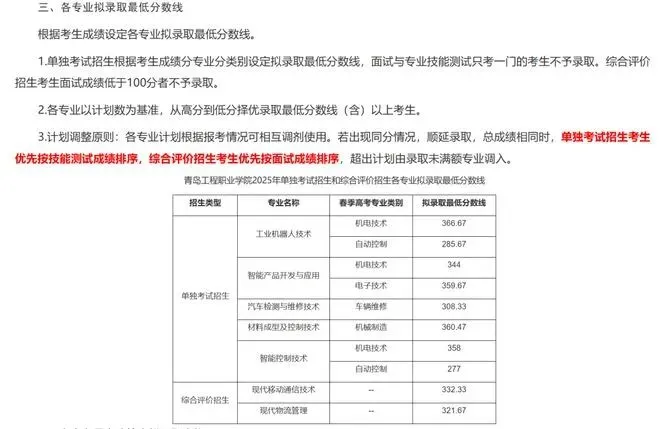 青岛工程职业学院单招综评录取分数线: