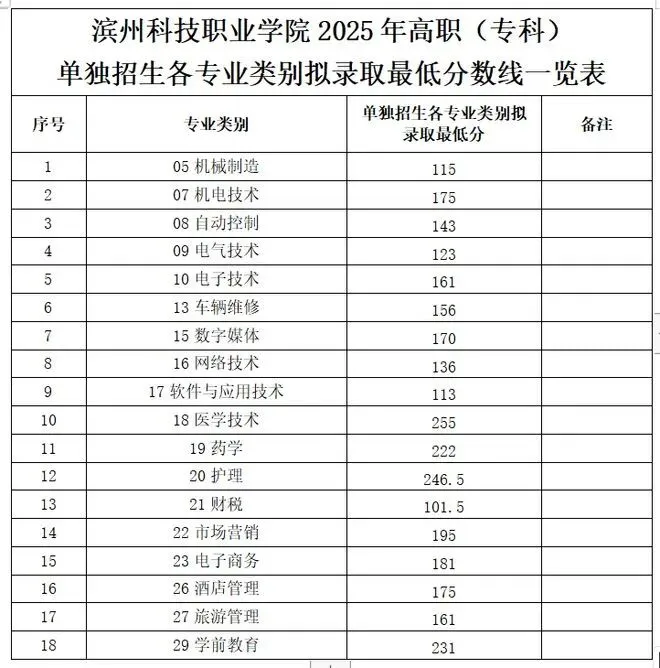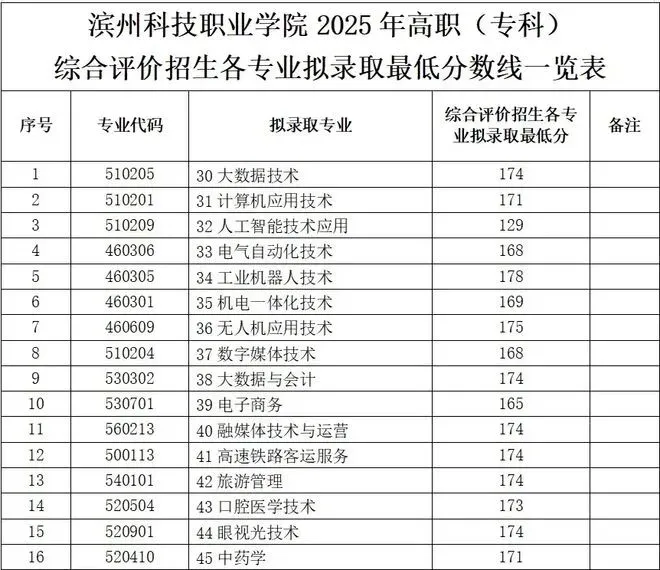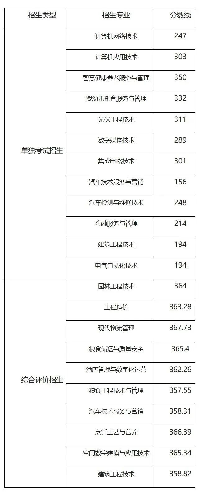 枣庄科技职业学院单招综评录取分数线: