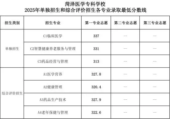 菏泽医学专科学校单招综评拟录取分数线: