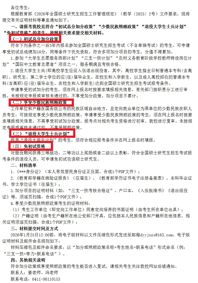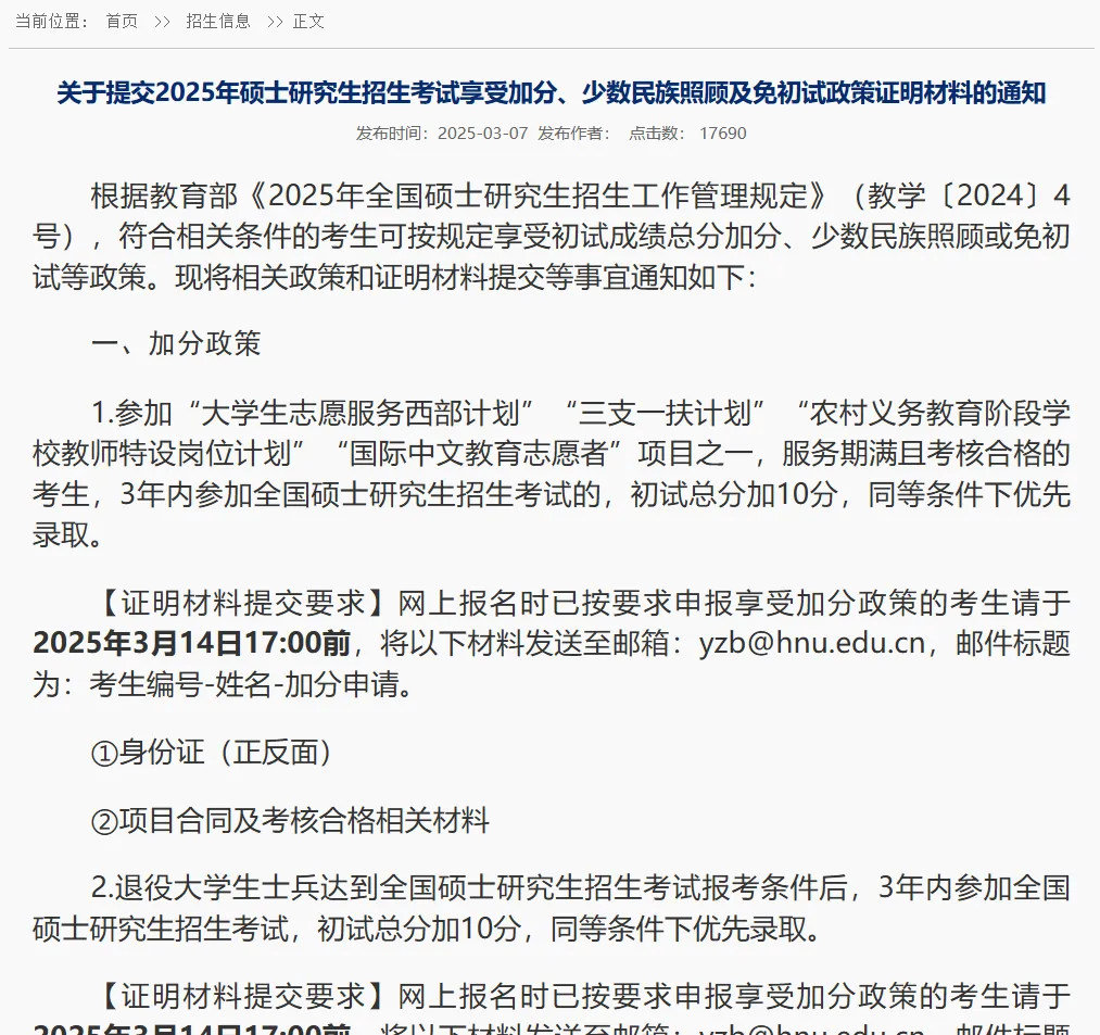 注意,满足以上加分政策的考生,一般在初试成绩公布后,复试分数线公布前,高校会发提交材料的通知,一定要在规定的时间内按照要求提交相应的证明材料,审核通过之后,可以加分。(如果学校官网没有发布,要在初试成绩公布后,主动联系学校提交材料。)
