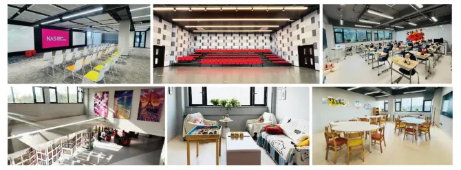 新亚学校校区占地面积60亩,采用智慧化校园,配备先进的硬件设施,包含标准教室、物理实验室、化学实验室、生物实验室、美术教室、音乐教室、舞蹈教室、科创中心、AI功能教室、250m²小剧场、220m²室内活动中心、27000m²体育中心,以及中西厨房、图书馆、教工咖吧、书吧和温馨住宿区。全校师生在有温度的校园中,构建起“有爱”的师生关系,在包容安全的氛围中,学生敢于探索、勇于表达。