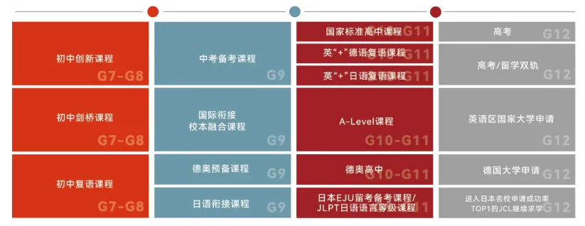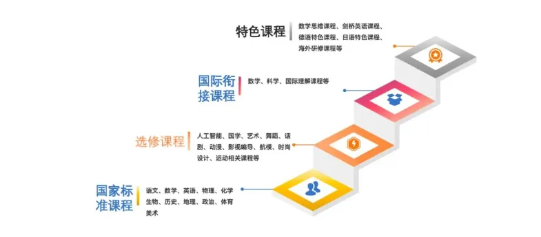 •国际升学赛道:德语班衔接德国DSD项目,直通德国高中-莱茵鲁尔中学;日语班对接日本EJU留考课程,与JCL等顶尖机构合作保障升学;剑桥班对标A-Level课程,毕业生可申请英、美、澳等多国高校。