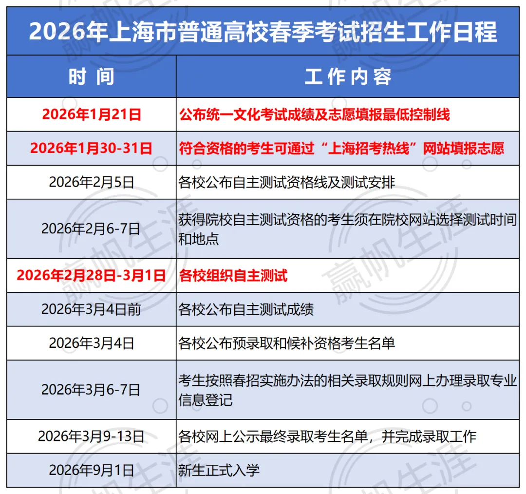 2026年上海市普通高校春季考试招生志愿填报将于1月30日9:00-22:00、1月31日9:00-16:00进行。