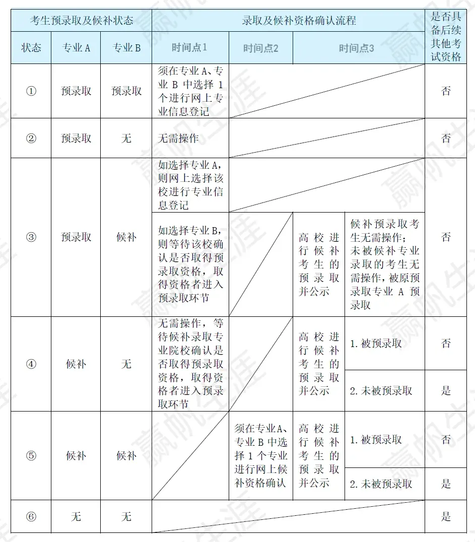 3️⃣如果A、B均候补录取,须在A、B两个专业中选择1个专业进行候补资格确认,如果院校确认其最终取得该专业预录取资格,无需操作,默认被预录取;如果没有取得该专业预录取资格,则须继续备战秋考;