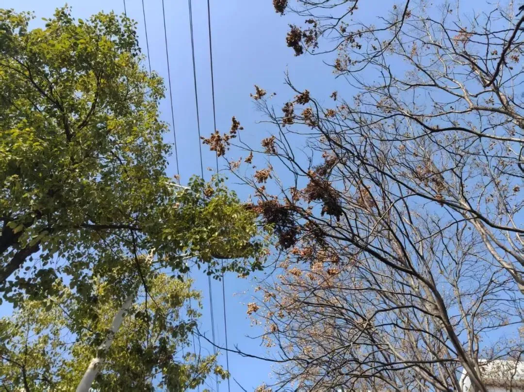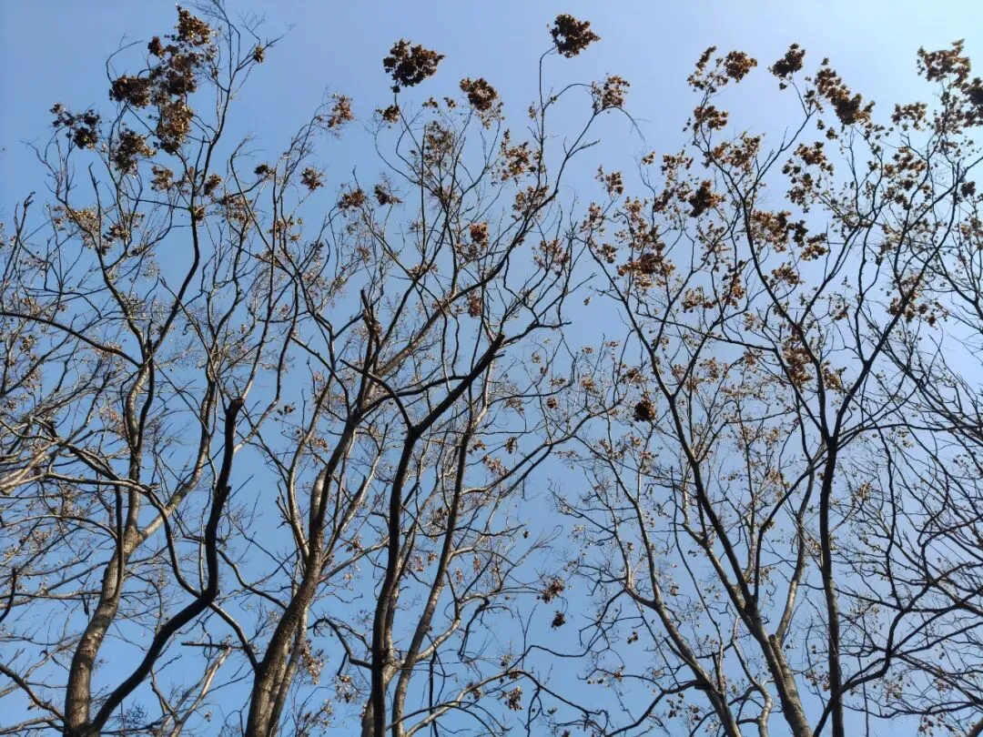 就在我抬头望天的刹那,一树深褐映入我的眼帘!这还是那棵我所熟悉的绚烂又多姿的栾树吗?它曾教多少人为之流连为之赞叹啊!可如今,绿油油的叶早不知所终,斑斓的灯盏也已然熄灭,只留下风霜反反复复洗礼后的簇簇蒴果,还在风中隐隐叹息……