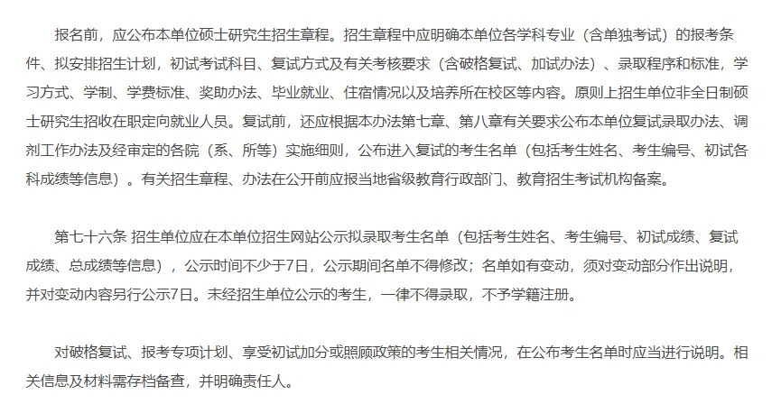 《26年新规》对于复试和录取阶段的信息公开要求更加细致,招生单位要统一公布招生人数、复试考生名单(包括考生姓名、考生编号、初试各科成绩等)等信息;统一公示拟录取考生名单(包括考生姓名、考生编号、初试成绩、复试成绩、总成绩等信息)。