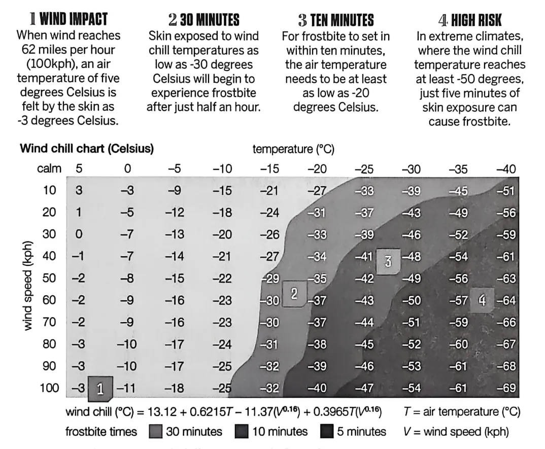 细节理解题。根据风寒图表来看:选项 A:-35℃气温+20km/h风速→风寒温度为-49℃,属于30分钟冻伤区。选项B:-30℃气温+60km/h风速→风寒温度为-50℃,属于5分钟冻伤区(黑色块)。选项C:-15℃气温+70km/h风速→风寒温度为-30℃,属于30分钟冻伤区。选项D:-10℃气温+100km/h风速→风寒温度为-25℃,属于10分钟冻伤区。可知,温度为零下30摄氏度,且风速为每小时60公里会处于“五分钟”冻伤区域。故选B。