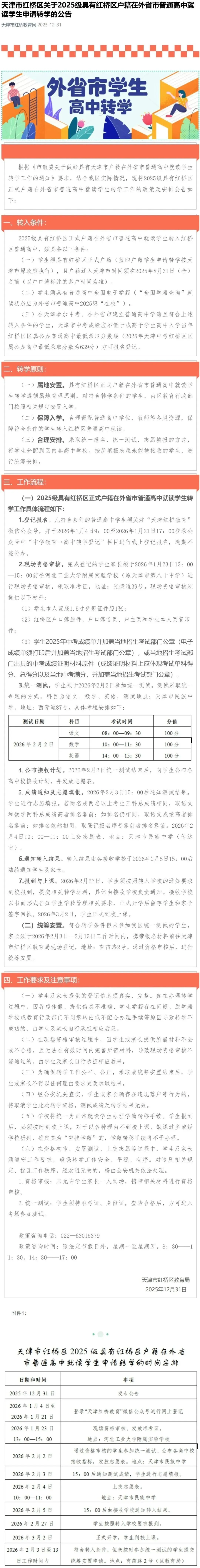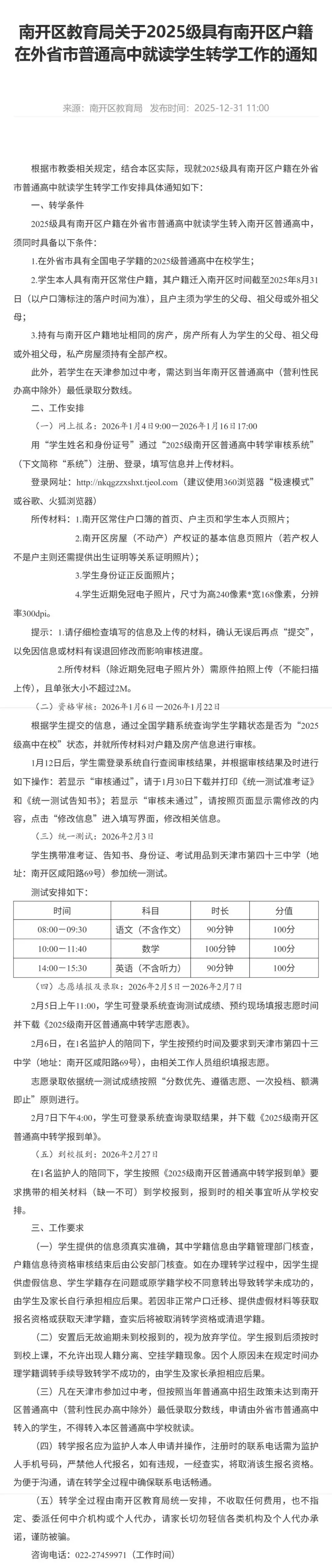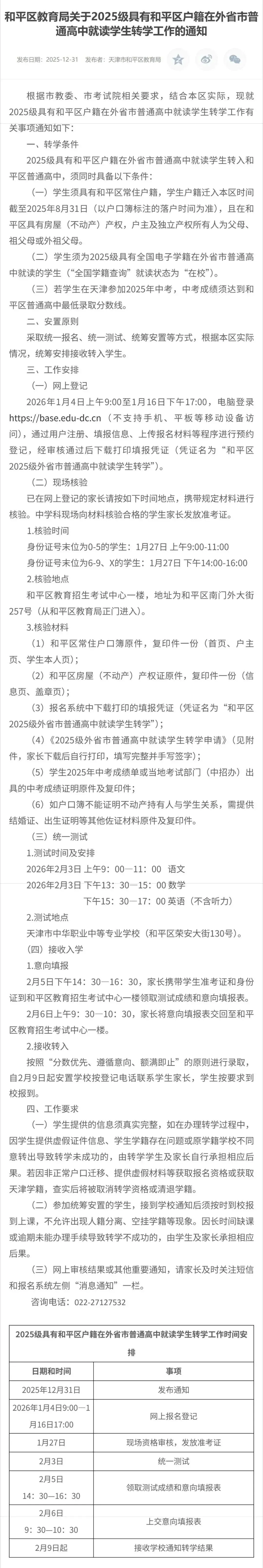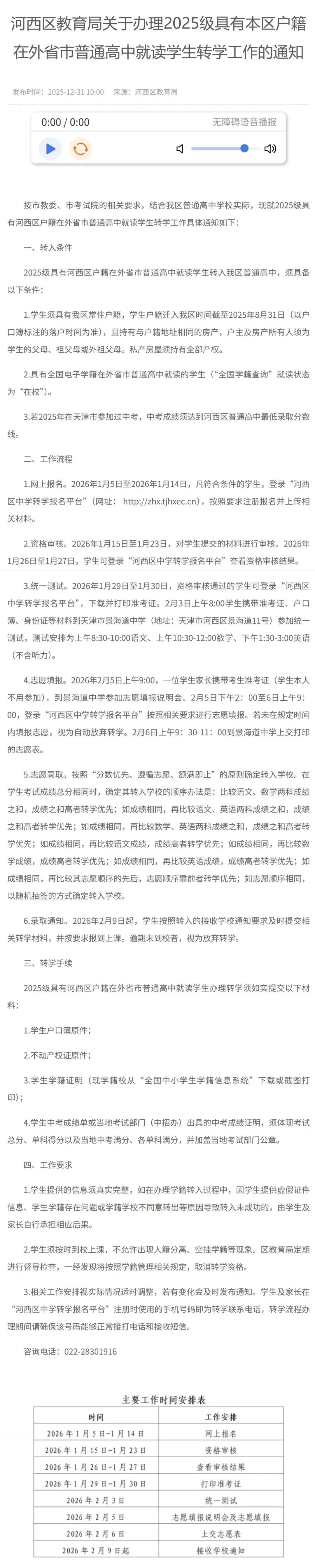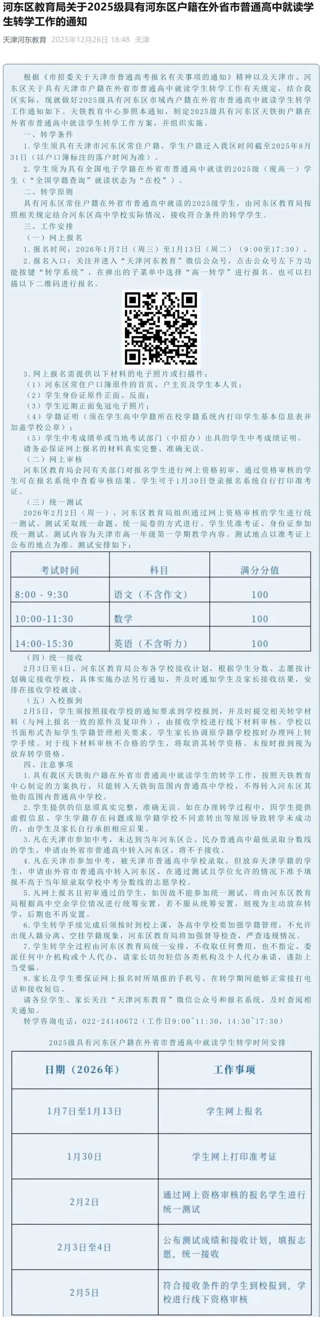 2026高一转学安置考!天津这几区公布考试时间及科目!关注收藏!