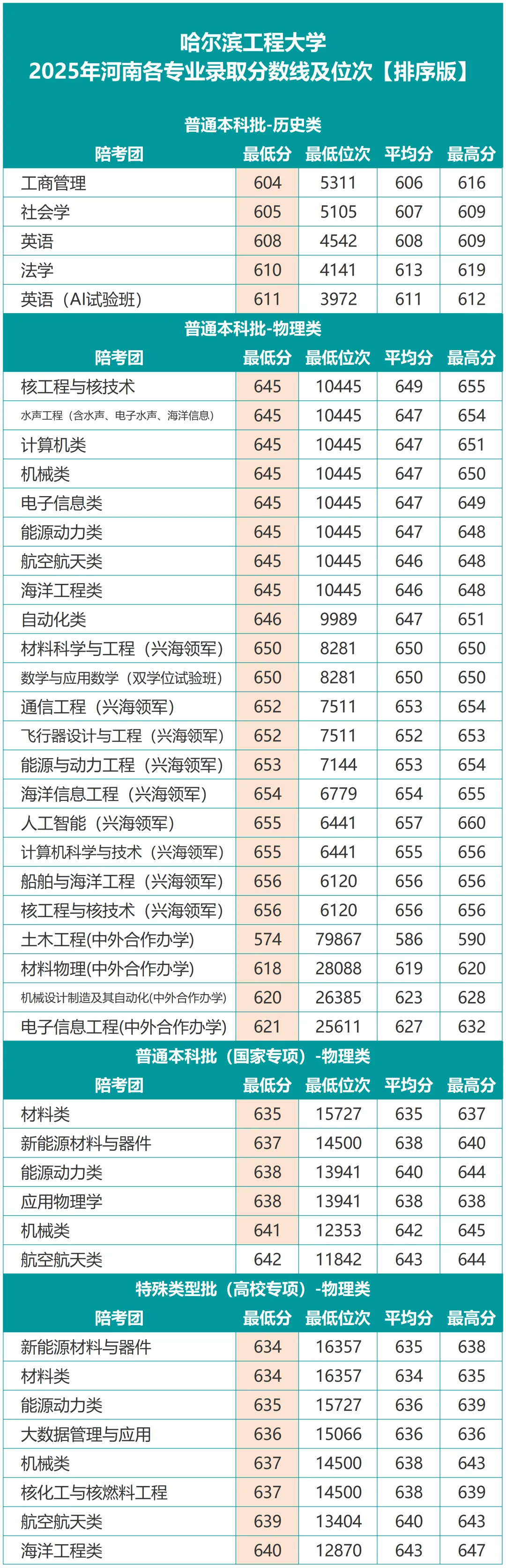 哈尔滨工程大学2025年河南各专业录取分数线及位次