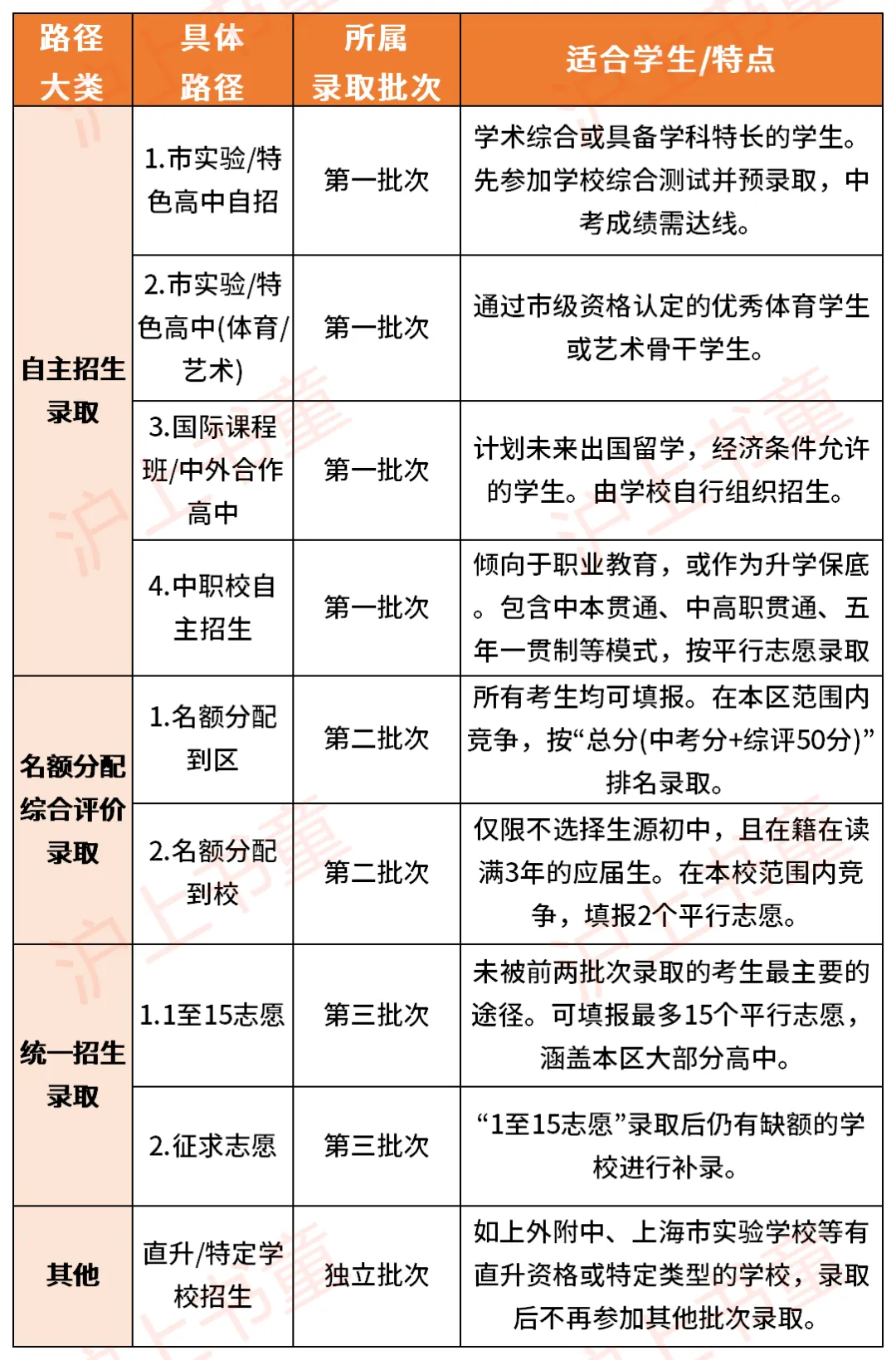 中职校自主招生:主要面向职业教育赛道,包含三类形式,1是中本贯通,仅限上海户籍考生,中考成绩需达普通高中最低投档线、2是中高职贯通、3是五年一贯制,后两者均需达对应类别最低控制线。