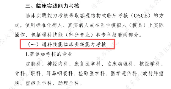 上述 13 个专业的专科技能考核,设置临床思维与决策、2 项专科技能操作共 3 个考核项目,需通科技能和专科技能考核均合格,才算临床实践能力考核合格。