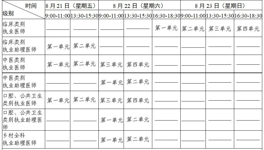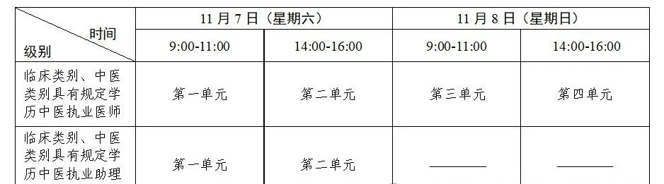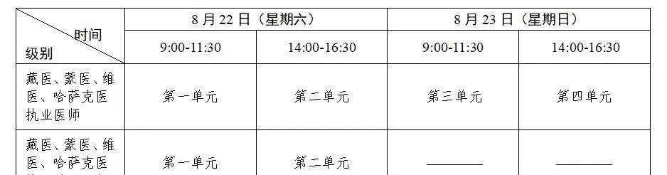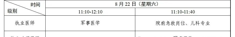 考试实行计算机化考试,军队现役人员、文职人员加试军事医学,院前急救岗位和儿科专业加试相应内容。中医类别藏医、蒙医、维医、哈萨克医专业实行纸笔考试。统一考试时间如下: