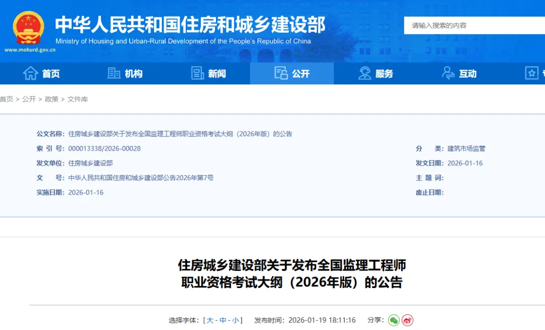 住房城乡建设部关于发布全国监理工程师职业资格考试大纲(2026年版)的公告