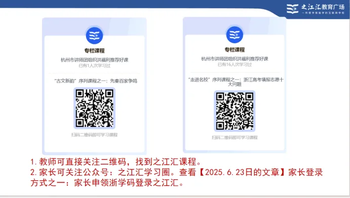 扫描本文后面的之江汇二维码,可以找到杭州市数字教育讲师团的公益课程,其中介绍了“高考升学的十八条升学路径”,还有对“浙江高考填报志愿的十大问题”进行初步探讨。