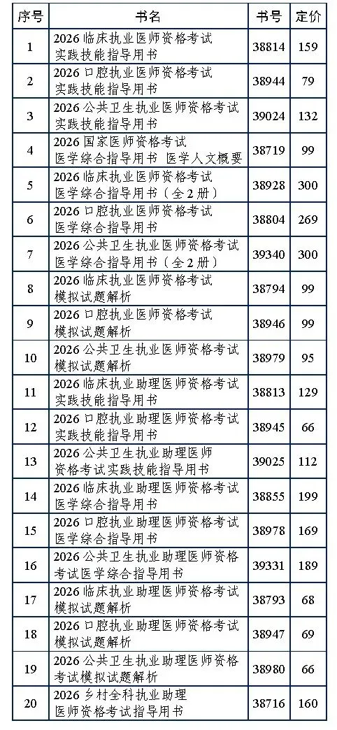 指导用书包括临床、口腔、公共卫生执业医师和执业助理医师两级三类的《实践技能指导用书》《医学综合指导用书》《模拟试题解析》,以及《医学人文概要》《乡村全科执业助理医师资格考试指导用书》等,共20种。