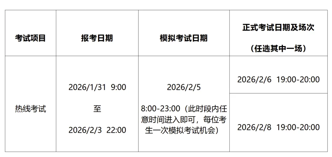 2026年2月热线考试报考即将开始,具体报考及考试时间安排如下: