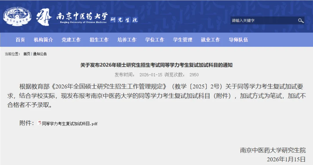 南京中医药大学前几天公布了同等学力考生复试加试科目的通知。