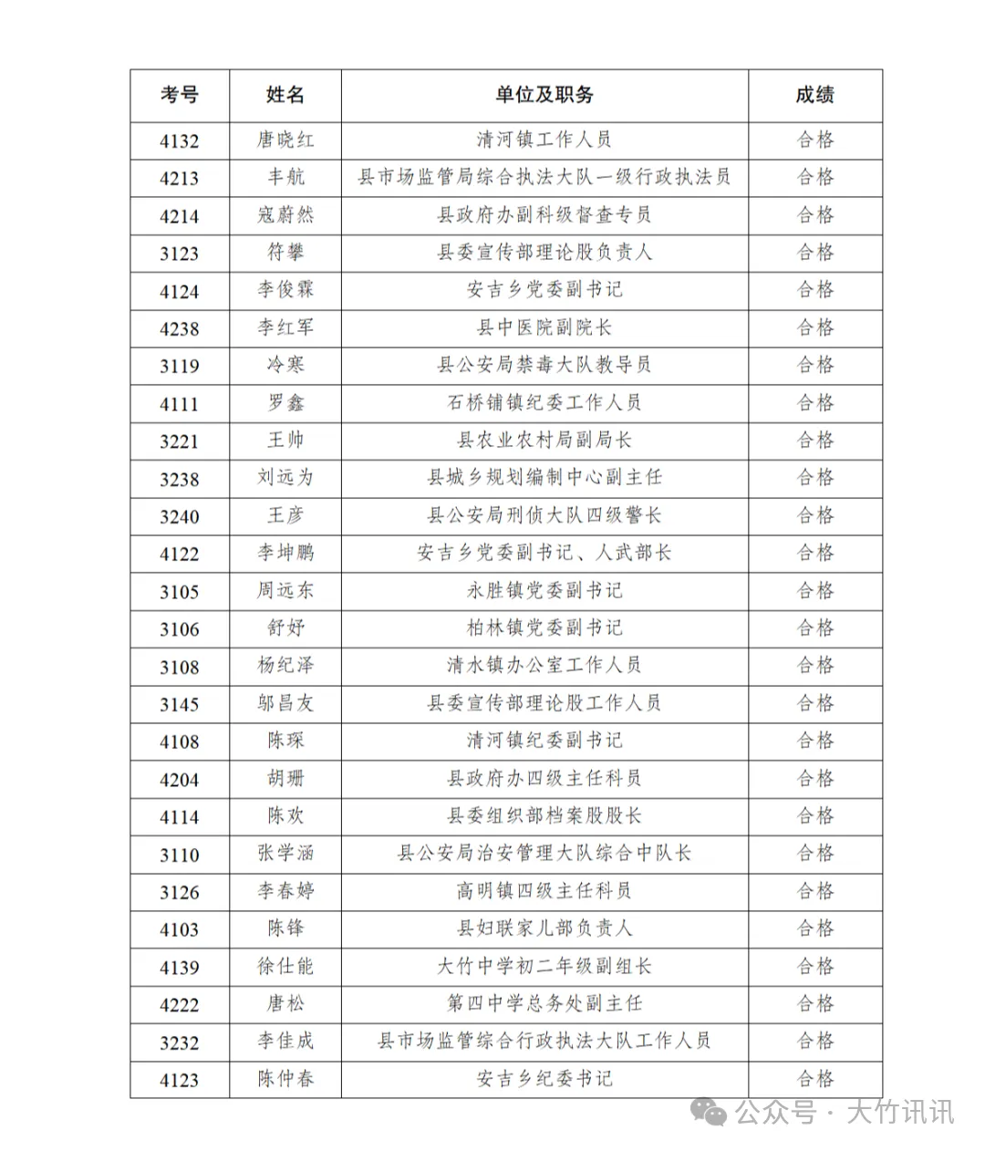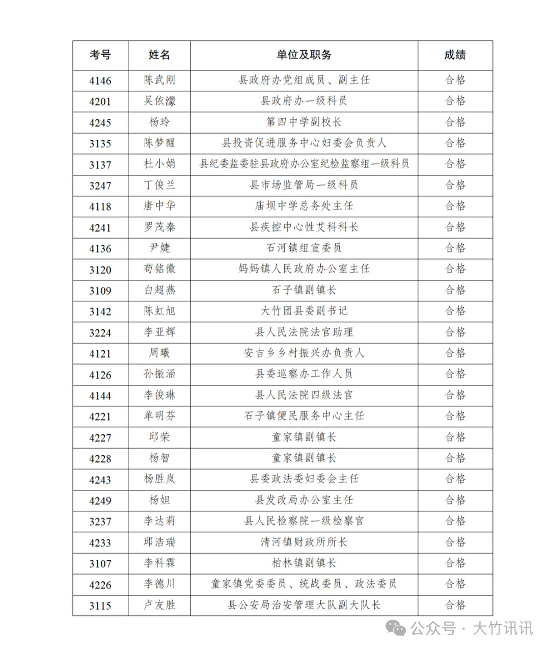 大竹县科级干部,任前考试成绩公示