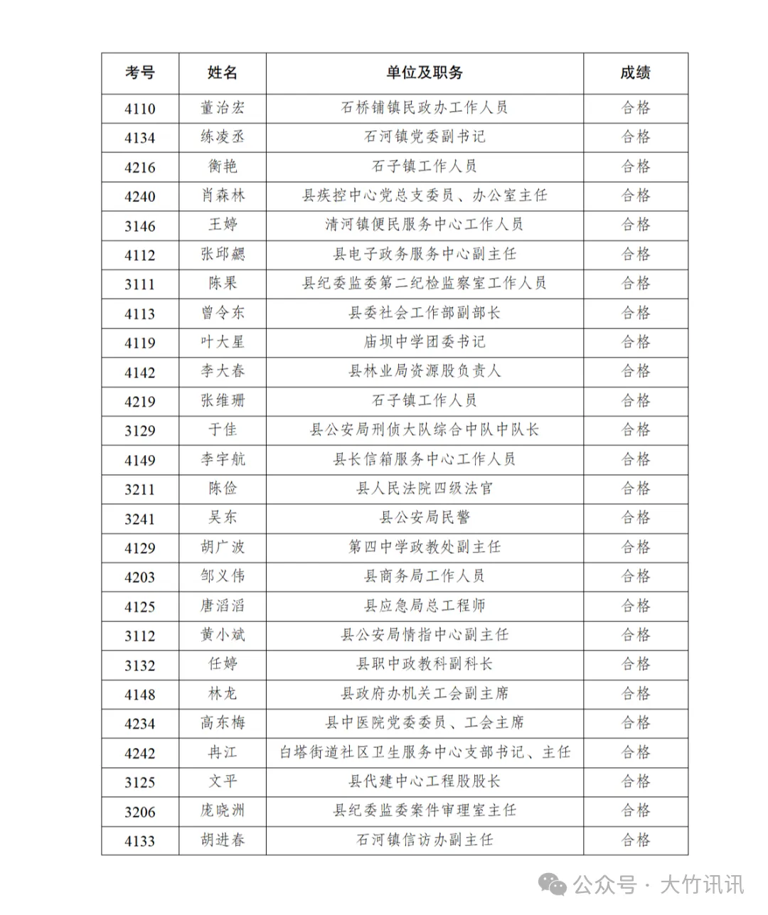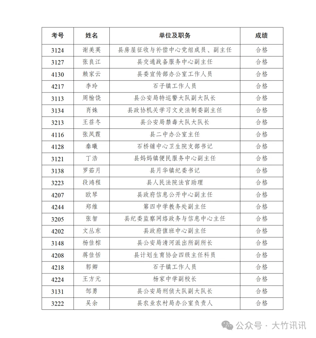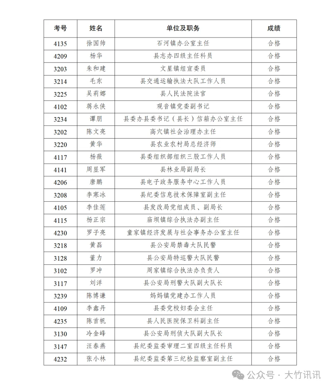 2026年1月25日,县纪委监委和县委组织部在大竹中学莲印校区荟文楼网络教室组织了2026年第一次科级领导干部任前政治理论水平考试,现将本次考试成绩合格人员名单公示如下。