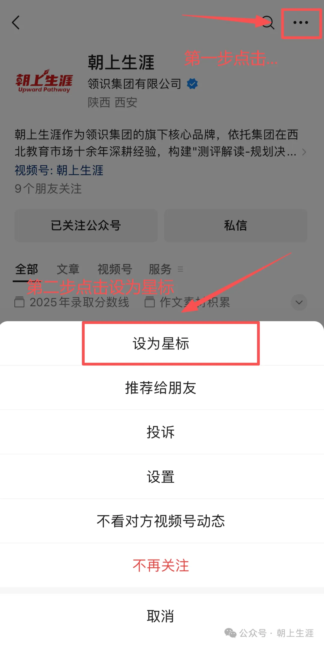 进入公众号主页,点击右上角的“···”,选择“设为星标”。这样后续有最新消息,你就能在微信首页直接看到,不用再翻找啦!