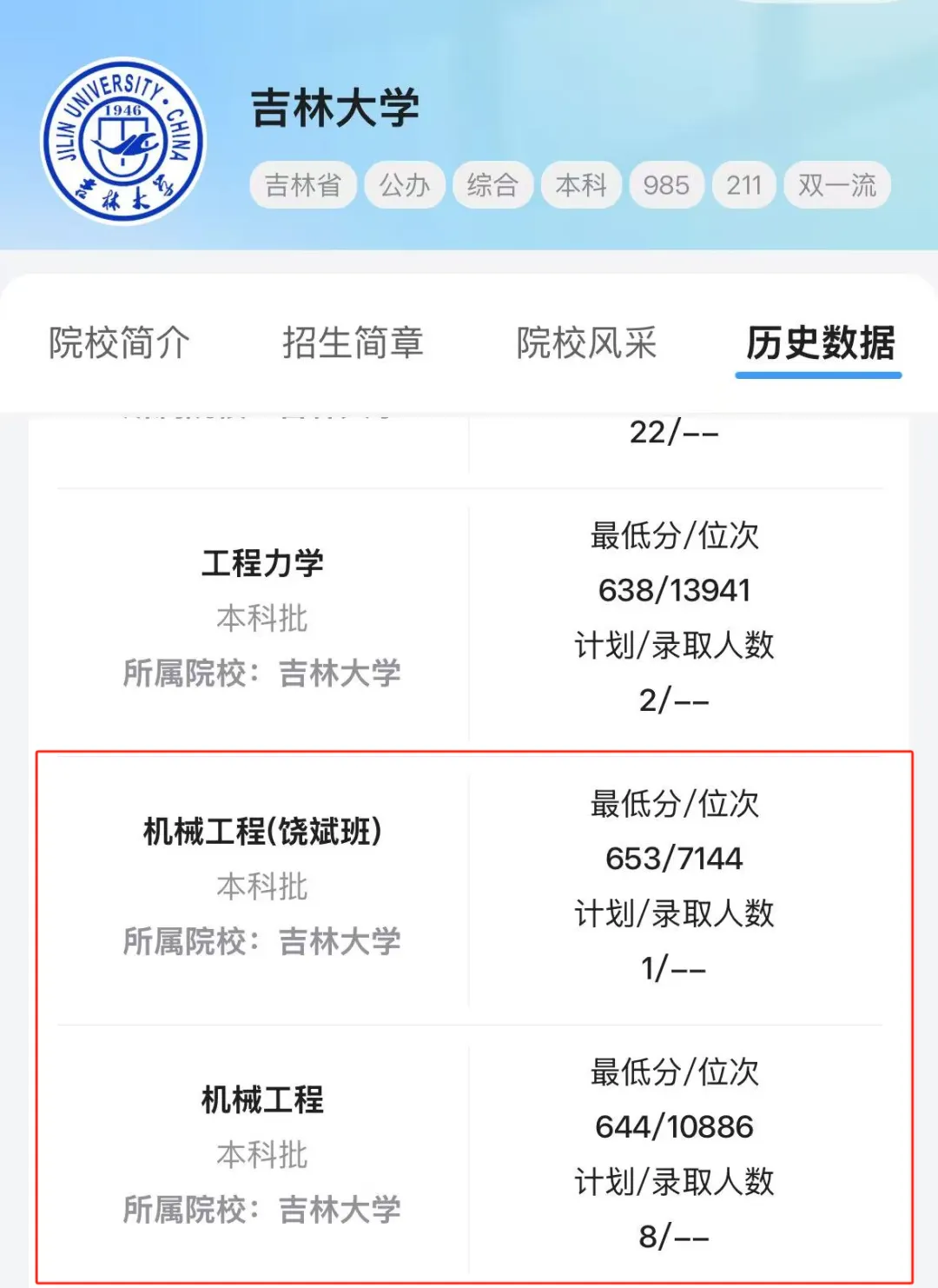 吉林大学是教育部直属的全国重点综合性大学,始建于1946年,1960年被列为国家重点大学,1984年成为首批建立研究生院的22所大学之一,是国家“211工程”“985工程”和首批“双一流”大学建设高校。学校学科门类齐全,下设48个教学单位,涵盖哲学、经济学、法学、教育学、文学、历史学、理学、工学、农学、医学、管理学、艺术学、交叉学科等13大学科门类;有本科招生专业121个。19个学科(领域)的ESI排名进入全球前1%,其中5个学科排名进入全球前1‰,1个学科排名进入全球前1‱。吉林大学机械与航空航天工程学院的前身是始建于1955年的长春汽车拖拉机学院机械制造系,由交通大学、华中工学院和山东工学院的相关专业组建而成,同年在全国首批招收研究生。学院的“机械工程”学科,2007年被遴选为一级学科国家重点学科。2017年,统筹建设的“机械电子工程”学科被遴选为国家国防特色学科。2022年,在国家“双一流”建设中,以机械工程作为牵头学科的机械与仿生工程学科群,被教育部批准为吉林大学重点建设的一流学科群。在全国第五轮学科评估中,机械工程学科评估结果为A。工程学ESI排名进入全球前1‰。学院现有机械工程、力学2个博士后科研流动站。机械工程专业入选国家首批“卓越工程师”教育培养计划,获批国家首批专业综合改革试点专业,2012年、2018年连续通过有效期为6年的全国工程教育专业认证,2019年被评选为国家级一流本科专业建设点。2022年,工业工程专业被评选为国家级一流本科专业建设点。吉林大学的机械工程专业2025年在河南省的招生情况如下。机械工程专业分为了机械工程(饶斌班)、机械工程。投档最低位次分别为:7144位次,10886位次。那么,机械工程(饶斌班)与机械工程专业有什么区别呢?据了解,吉林大学机械工程饶斌班设立于2024年,旨在培养具有国际视野和创新能力的高层次机械工程领军人才。该班以中国汽车工业先驱饶斌命名,突出“机械学科深造”和“创新能力培养”两大核心方向,通过本硕博贯通培养体系,助力学生在高端装备制造、智能机械等领域突破学术与产业瓶颈。