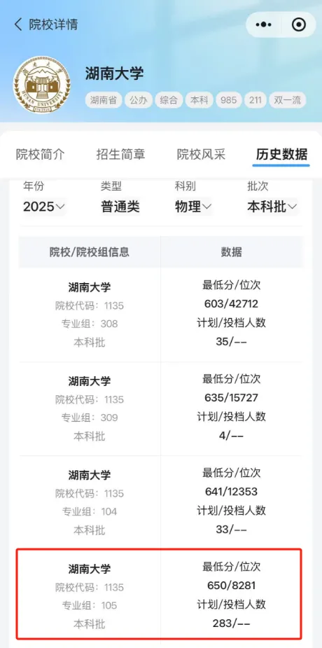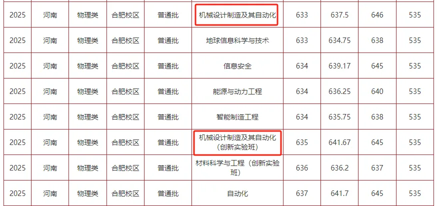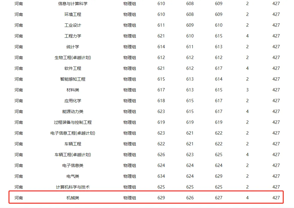 湖南大学是教育部直属全国重点大学、“211工程” “985工程”和“世界一流大学”建设高校。学校办学起源于公元976年创办的岳麓书院,1903年岳麓书院与创办于1897年的时务学堂改制设立的湖南高等学堂合并,1926年定名湖南大学,1937年成为全国16所国立大学之一。2000年,湖南大学与湖南财经学院合并组建成新的湖南大学。学校现有37个教学科研机构,学科专业涵盖哲学、经济学、法学、教育学、文学、历史学、理学、工学、管理学、医学、农学、艺术学、交叉学科等13大门类。拥有本科专业87个,硕士一级学科学位授予点40个、博士一级学科学位授予点36个。学校获批学位授权自主审核单位。化学、机械工程、电气工程学科进入“世界一流学科”建设行列。马克思主义学院入选全国重点马克思主义学院。5个学科进入ESI全球前1‰,工程学进入全球前1‱。2025年自然指数排名居全球第41位。湖南大学机械与运载工程学院的前身为1908年兴办的机械科,是湖南大学历史最悠久的院系之一。设置机械设计制造及其自动化、车辆工程、能源与动力工程、工业工程、工程力学、智能制造工程、智能车辆工程等7个本科专业。学院现设有机械工程、力学2个一级学科博士点,8个二级学科博士点、2个博士后科研流动站、11个硕士点、2个专业硕士点;机械工程学科为一级学科国家重点学科、教育部“世界一流建设学科”,有湖南省重点学科2个。湖南大学机械类专业2025年在河南的招生情况官方暂未公布。105专业组(含智能制造工程、智能车辆工程、工程力学(力学试验班))的投档最低分为650分,对应位次为8281位次。据了解,智能制造工程包含智能制造工程、机械设计制造及其自动化、工业工程三个专业,专业分流时在上述专业内任选;机械设计制造及其自动化、工业工程为国家级一流本科专业建设点;依托机械工程世界一流建设学科和国家重点学科建设;入校后可选拔进入能源与动力工程专业(未来能源与动力创新实验班,开展“双碳”战略目标引领的深度产教融合贯通项目式育人模式改革)、工科试验班(人工智能类)。智能车辆工程包含智能车辆工程、车辆工程、工业工程三个专业,专业分流时在上述专业内任选;车辆工程、工业工程为国家级一流本科专业建设点;依托机械工程世界一流建设学科和国家重点学科建设;拥有“整车先进设计制造技术全国重点实验室”等专业教学实践基地;入校后可选拔进入能源与动力工程专业(未来能源与动力创新实验班,开展“双碳”战略目标引领的深度产教融合贯通项目式育人模式改革)、工科试验班(人工智能类)。工程力学(力学试验班)专业为国家级一流本科专业建设点;项目制和导师制培养;入校后可选拔进入理科试验班。合肥工业大学是中华人民共和国教育部直属全国重点大学,教育部、工信部和安徽省政府共建高校,国防科工局与教育部共建高校。学校创建于1945年,1960年被中共中央批准为全国重点大学。学校2005年成为国家“211工程”重点建设高校,2009年成为国家“985工程”优势学科创新平台建设高校,2017年进入国家“双一流”建设高校行列。学校高质量完成了首轮“双一流”建设任务,顺利进入新一轮“双一流”建设,12个学科进入ESI全球排名前百分之一,其中工程学学科进入ESI全球排名前万分之四。合肥工业大学机械工程学院始建于学校成立初期的机械科,曾被誉为“机械四小龙”。机械工程作为学校重点传统优势学科,是国家“211”、“985优势创新平台”重点建设学科和国家“双一流”重点建设骨干学科。学科于1981、1984、1987年分别获得机械制造、汽车和机械学硕士学位点,1990、1997年分别获得机械制造和机械设计及理论博士学位点,1999年获准机械工程博士后流动站,2000年获得机械工程一级学科博士学位点,2007年“机械设计及理论”获批国家级重点学科。学院现有机械设计制造及其自动化、工业工程、机械工程、飞行器制造工程 、过程装备与控制工程、智能制造工程6个本科专业,其中“机械设计制造及其自动化” “工业工程”入选国家一流本科专业、“机械设计制造及其自动化”连续四次通过国际工程教育专业认证。合肥工业大学机械类专业2025年在河南省投档分如下。机械类专业的投档最低分在633分,可见该校的机械类专业的竞争还是很激烈的。燕山大学是河北省人民政府、教育部、工业和信息化部、国家国防科技工业局四方共建的全国重点大学,河北省重点支持的国家一流大学和世界一流学科建设高校,北京高科大学联盟成员。学校有34个专业入选国家级一流本科专业建设点。现有19个工科专业通过工程教育专业认证(评估)。工程学、材料科学、化学、计算机科学、环境科学与生态学、物理学等6个学科进入ESI排名全球前1%,其中工程学学科排名已进入全球前1‰。在教育部第五轮学科评估中取得突破性进展,机械工程、材料科学与工程两个学科跻身中国高校第一方阵,部分学科实现跨级提升。燕山大学机械工程学院源于哈尔滨工业大学重型机械系。1958年哈尔滨工业大学重型机械系及相关学科整建制迁至工业重镇齐齐哈尔市富拉尔基区,成立哈尔滨工业大学富拉尔基重型机械学院。1985年东北重型机械学院在秦皇岛创建分校(燕山大学),南北两校分设机械一系、机械二系和冶金机械系、机械系。1997年南北