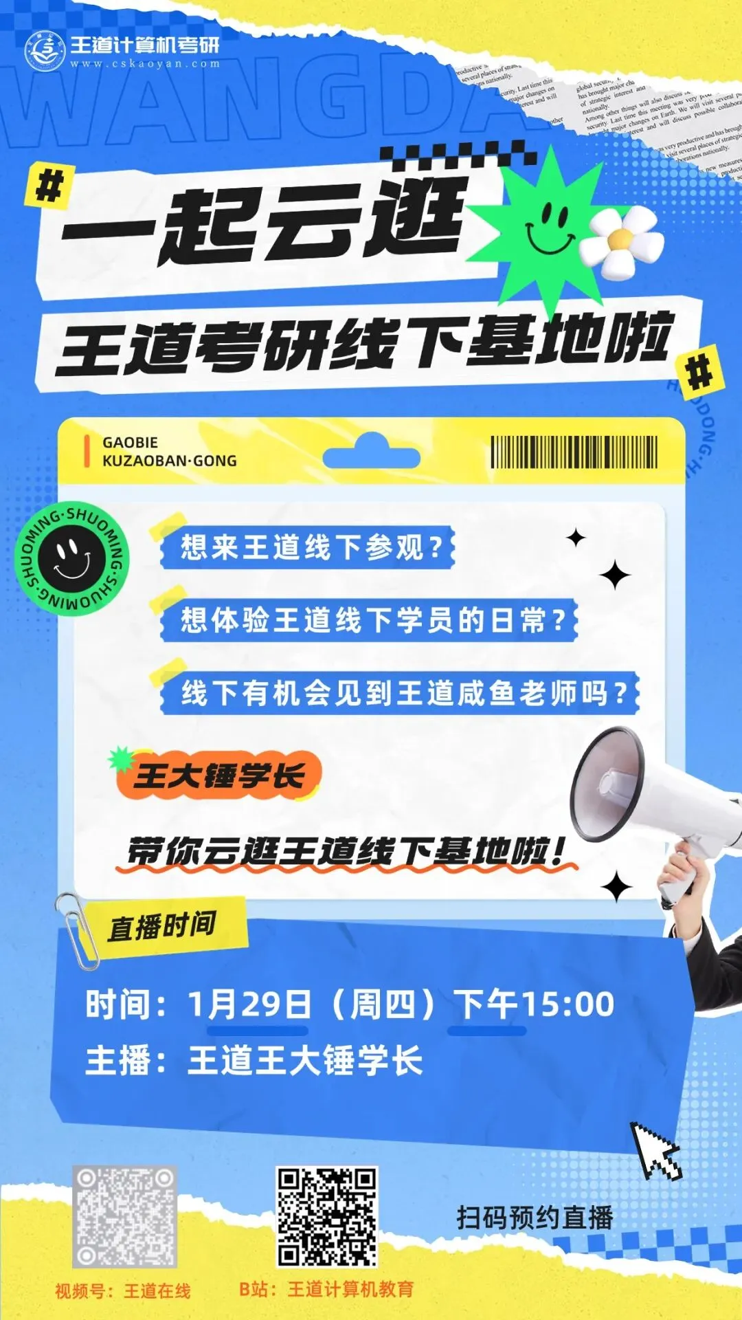 明天下午15:00,王道王大锤学长将带着大家「云逛」王道考研线下基地!从坐满研友的沉浸式自习室,到线下学员的真实备考节奏,我们都将在直播间里一一解锁。王道静音自习室、网课室、背书室、讨论室等活动空间丰富,满足备考各类需求。