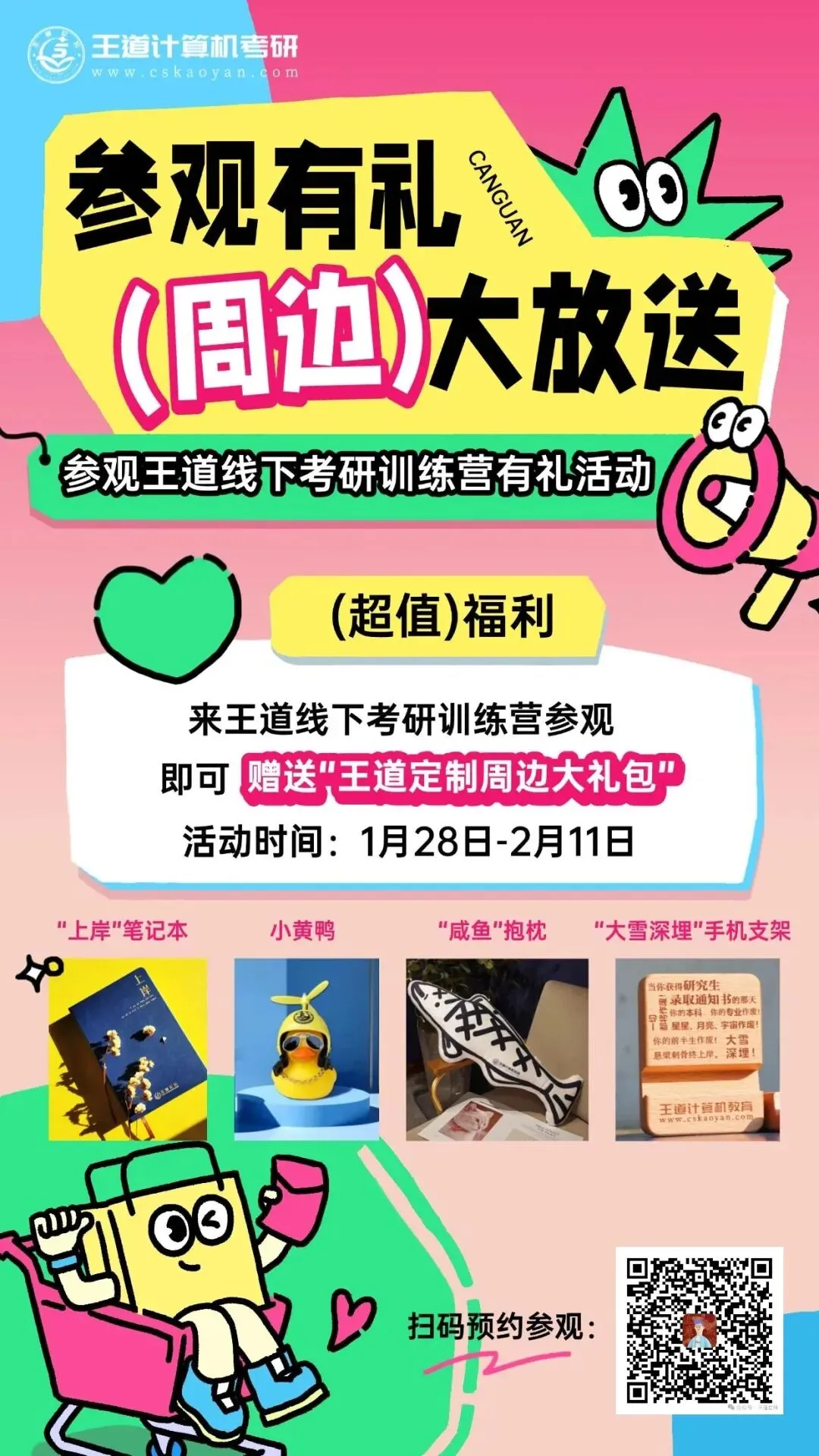 从1月28日到2月11日,只要来王道线下考研训练营实地参观,就能直接抱走「王道定制周边大礼包」!里面有王道自制的“上岸” 笔记本、王道标志性小黄鸭、软fufu的“咸鱼”抱枕,还有戳中备考人群心理的手机支架 —— 全是备考期间能用得上、还能当 “上岸” 信物的好东西。这波福利大家可别错过啦!云逛过眼瘾,线下拿好礼,王道这波把备考仪式感直接拉满了!想参与线下训练营参观活动的同学,可以扫码添加老师预约哦~