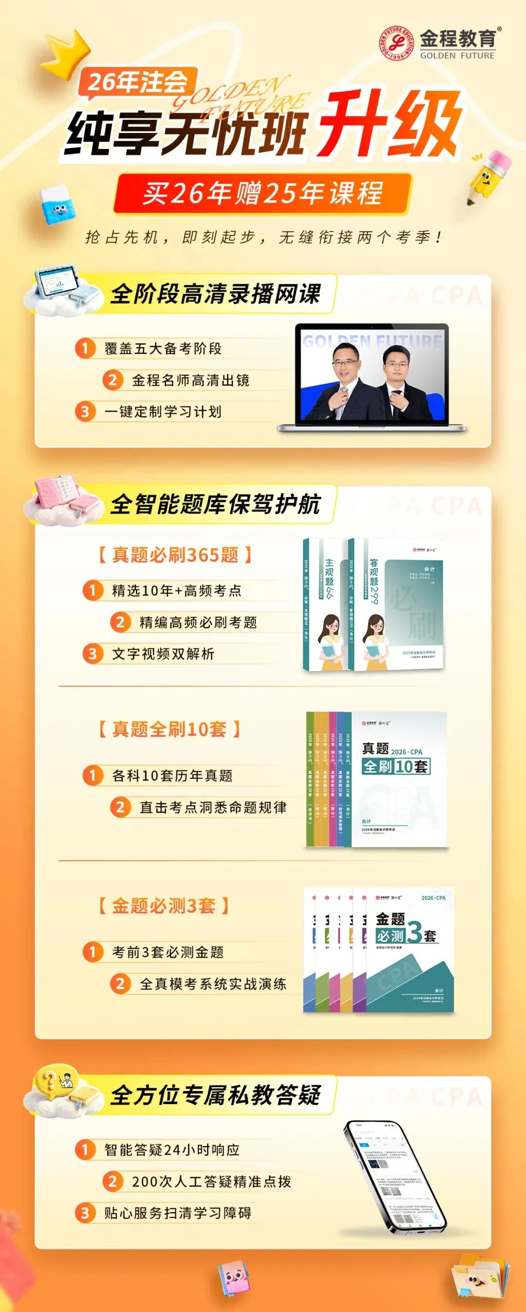 为了帮助大家更好的备考,2026注会纯享无忧班全新升级,现推出 “报26年,赠25年” 限时福利!提前起步,赢在起点。