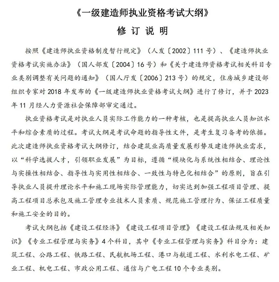 根据《建造师执业资格制度暂行规定》(人发〔2002〕111号)、《建造师执业资格考试实施办法》(国人部发〔2004〕16号)和《关于建造师资格考试相关科目专业类别调整有关问题的通知》(国人厅发〔2006〕213号)的规定,我部组织修订了《一级建造师执业资格考试大纲》(2024年版)和《二级建造师执业资格考试大纲》(2024年版),经人力资源社会保障部审定,现向社会公布,自2024年1月1日起执行。《一级建造师执业资格考试大纲》(2018年版)和《二级建造师执业资格考试大纲》(2019年版)同时废止。